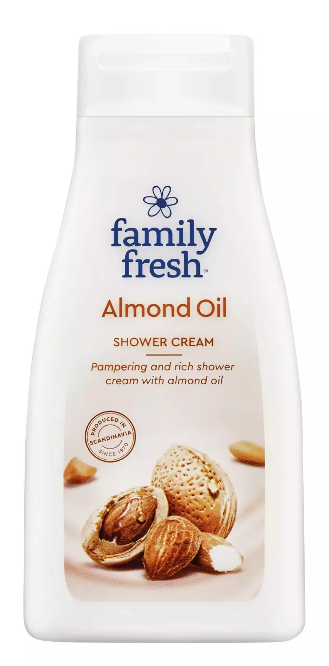 Family Fresh Almond Oil suihkusaippua sisältää kosteuttavaa ja hoitavaa manteliöljyä. Suihkusaippuan ylellinen tuoksu on saanut inspiraationsa manteleiden täyteläisestä tuoksusta. Täyteläinen vaahto antaa silkkisen ja pehmeän tunteen. Haemme inspiraatiota ainutlaatuisesta luonnosta; kauniisti kukkivista kedoista ja pohjattoman lumoavasta metsästä, auringon lämmittämistä hedelmistä ja raikkaista marjoista. Puhdasta iloa koko perheelle.
