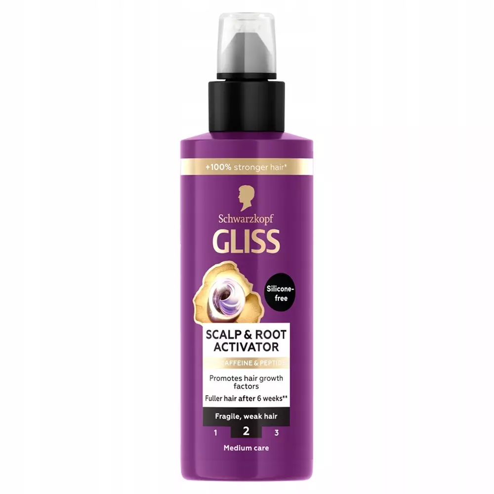Schwarzkopf Gliss Full Hair Wonder Scalp & Root Activator 100 ml – hiuspohjaseerumi hauraille ja heikoille hiuksilleTämä hiuspohjaa ja juuria aktivoiva hoito hauraille ja heikoille hiuksille yhdistää kofeiinia ja peptidejä ja auttaa edistämään hiusten kasvutekijöitä, jotka tekevät hiuksista tuuheammat jo 6 viikossa*.Gliss Care -taso: 2 – Keskitason hoitavuutta, tasapainoinen yhdistelmä ravitsevia ainesosia.Tämä Gliss-seerumi heikoille ja hauraille hiuksille stimuloi ja vahvistaa juuria ja tehostaa karvatuppien toimintaa jättämättä jäämiä hiuksiin tai tyynyyn. Hiusten tyviboosterissa on miellyttävä myskin tuoksu, ja sen koostumus sisältää 96 % luonnollista alkuperää olevia ainesosia, ml. vettä. Gliss-hiustuotteet ovat PETA:n hyväksymiä**. Koostumus on myös silikoniton ja vegaaninen***.Käyttö: Levitä seerumia aamuin ja illoin hiuspohjaan 3-5 osassa märkiin tai kuiviin hiuksiin. Hiero ja anna seerumin imeytyä kokonaan. Älä huuhtele! Saat parhaan tuloksen, kun käytät tuotetta 2 kertaa päivässä 6 viikon ajan. Parhaan lopputuloksen saat, kun käytät tuotetta yhdessä Full Hair Wonder -shampoon kanssa.Tuotteen hyödyt lyhyesti:Hiuspohjaseerumi tekee hiuksista tuuheammat vain 6 viikossa*Hauraille ja heikoille hiuksilleGliss Care -taso 2 - Keskitason hoitavuusEdistää hiusten kasvutekijöitä100 % vahvemmat hiukset****Sisältää kofeiinia ja peptidejä96 % ainesosista luonnollista alkuperää, mukaan lukien vesi100 ml*vähemmän katkeilua säännöllisessä käytössä**maailmanlaajuinen eläinkokeisiin liittyvä käytäntö***ei sisällä eläinperäisiä ainesosia****verrattuna käsittelemättömiin hiuksiin yhdessä shampoon kanssa