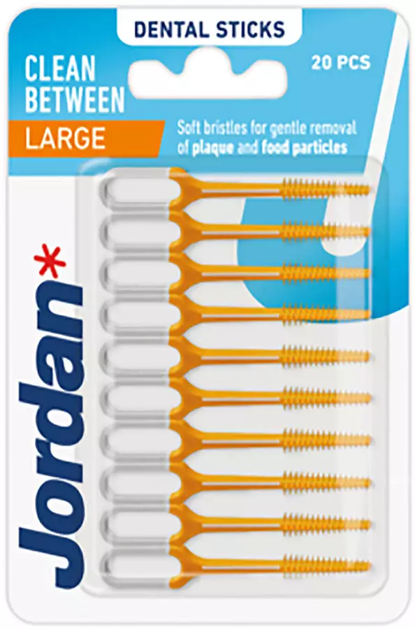 Jordan Clean Between -hammastikun pehmeät ja miellyttävät kumiharjakset liukuvat hammasväleihin helposti ja turvallisesti. Tikut hierovat hellästi ikeniä ja parantavat niiden verenkiertoa. Jordan Clean Between Large - L-kokoiset hammastikut, sopivat parhaiten leveille hammasväleille.