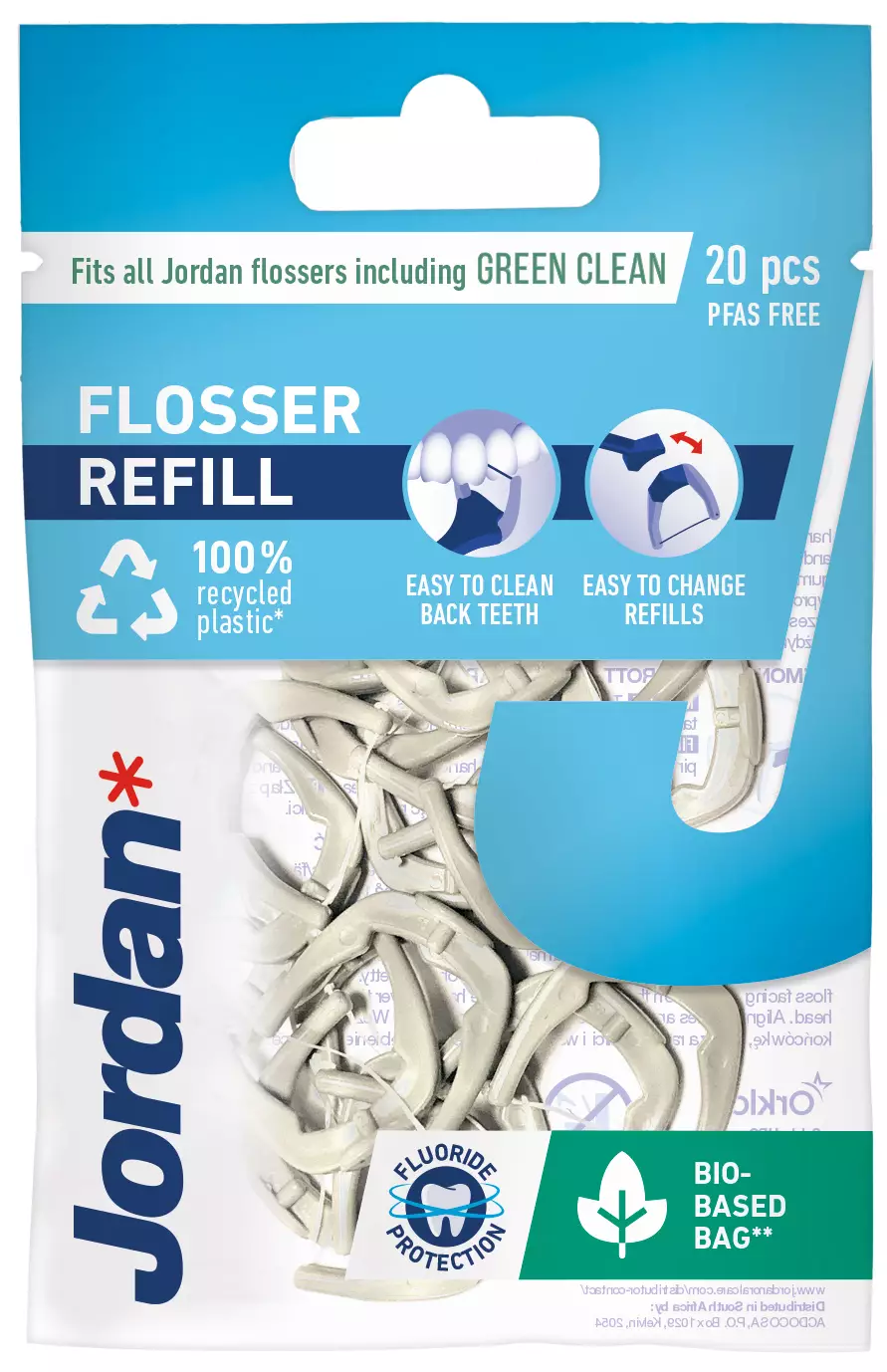 Jordan Easy Clean Flosser -hammaslankaimen täyttöpakkaus sisältää 20 kpl fluoria sisältäviä lankainosia. Irrota lankainosa painamalla sitä varovasti tasaista pintaa vasten. Kiinnitä uusi lankainosa vartta apuna käyttäen uurrettu puoli alaspäin. Kuulet naksahduksen kun lankainosa on kiinnitetty. Vaihtopää 100 % kierrätysmuovia.