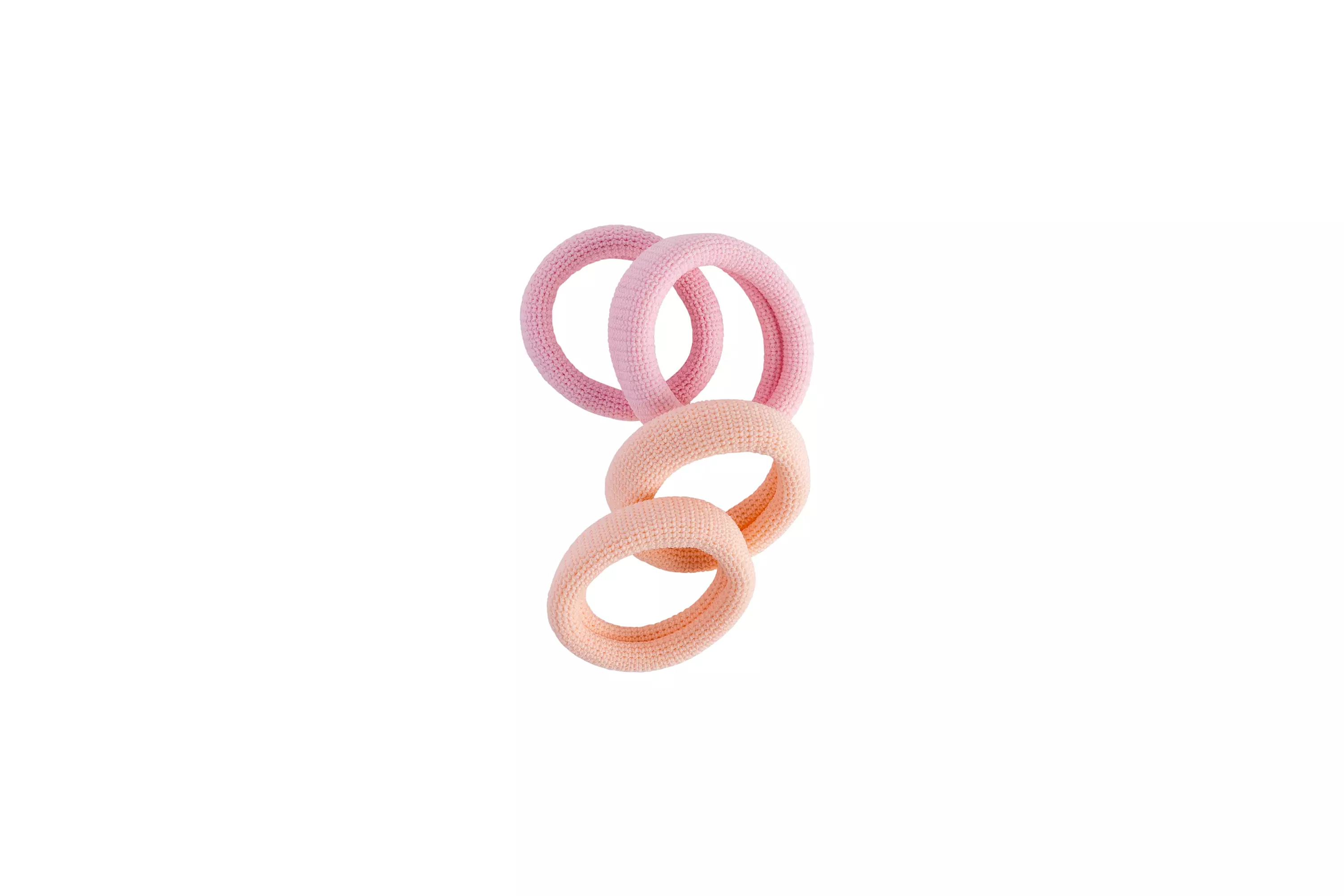 Lasten neljän kappaleen hiuslenkkisetti. Setti sisältää kaksi kappaletta vaalean pinkkejä sekä kaksi kappaletta vaalean persikan sävyisiä paksuja hiuslenkkejä. Hiuslenkin halkaisija n. 5,5 cm. Materiaali: joustava kangas.