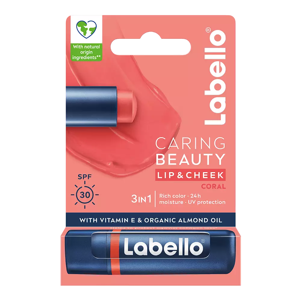 Labello Caring Beauty Coral - sävyttävä voide huulille ja poskille. Kosteuttaa huulia ja ihoa 24 tunnin ajan. Voidemainen koostumus antaa intensiivisen värin, käytä huulivoiteena, poskipunana tai molempina! 3in1-koostumus tarjoaa sävyn, hoitoa ja suojaa! Sisältää E-vitamiinia ja luonnollista manteiöljyä, joka ravitsee tehokkaasti huulia. Suojakerroin 30 suojaa ihoa UV-säteilyltä ja sen aiheuttamalta kollageenin vähenemiseltä. Tekee huulista ihanan pehmeät ja sileät ja ehkäisee niiden kuivumista. Voide on helppo levittää, kokeile myös kerrostaa yhdessä muiden Labello Caring Beauty -sävyjen kanssa ja luo ainutlaatuinen sävysi!