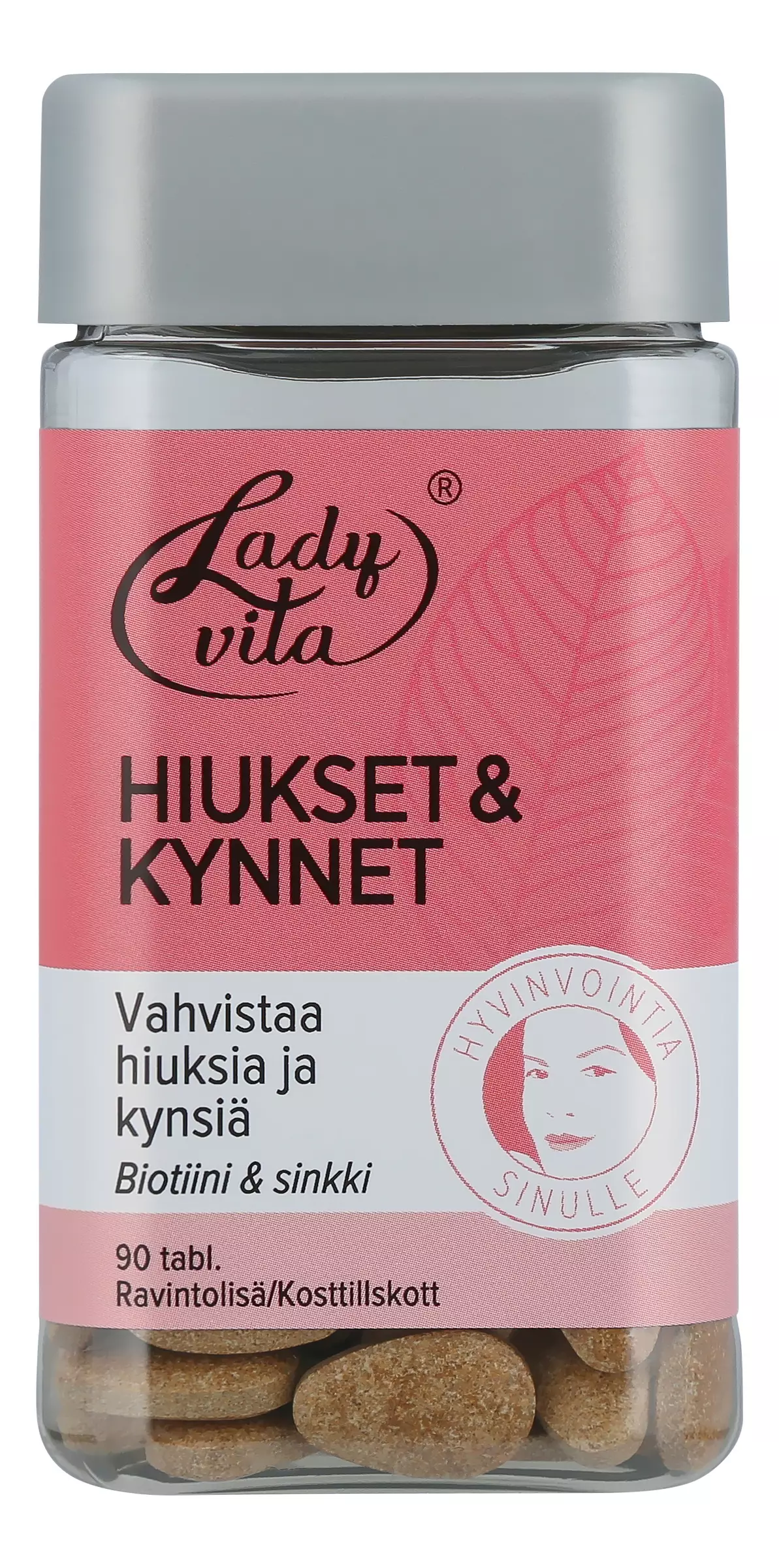Ladyvita Hiukset & kynnet on ravintolisä, joka sisältää hiuksia ja kynsiä vahvistavia ravintoaineita: Biotiini ja sinkki edistävät hiusten pysymistä normaaleina ja sinkki myös kynsien pysymistä normaaleina. Kupari tukee hiusten normaalia pigmentoitumista. Tabletti on mantelinmuotoinen, minkä vuoksi tabletti on helpompi niellä kuin pyöreä tabletti. Tablettimuoto on kliinisesti testattu. Ravintolisä ei korvaa monipuolista ja tasapainoista ruokavaliota eikä terveitä elämäntapoja. Purkki on valmistettu osittain kierrätysmuovista.