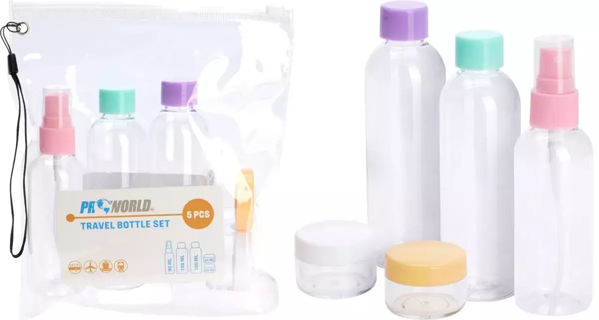 Kätevä matkasetti, jossa on 5 eriväristä purkkia ja säilytyspussi. Täydellinen shampoon, voiteiden tai muiden hoitotuotteiden mukaan ottamiseen. Ihanteellinen matkoille tai liikkeellä ollessa. Setti on valmistettu kestävästä PP-materiaalista ja helppo puhdistaa.
