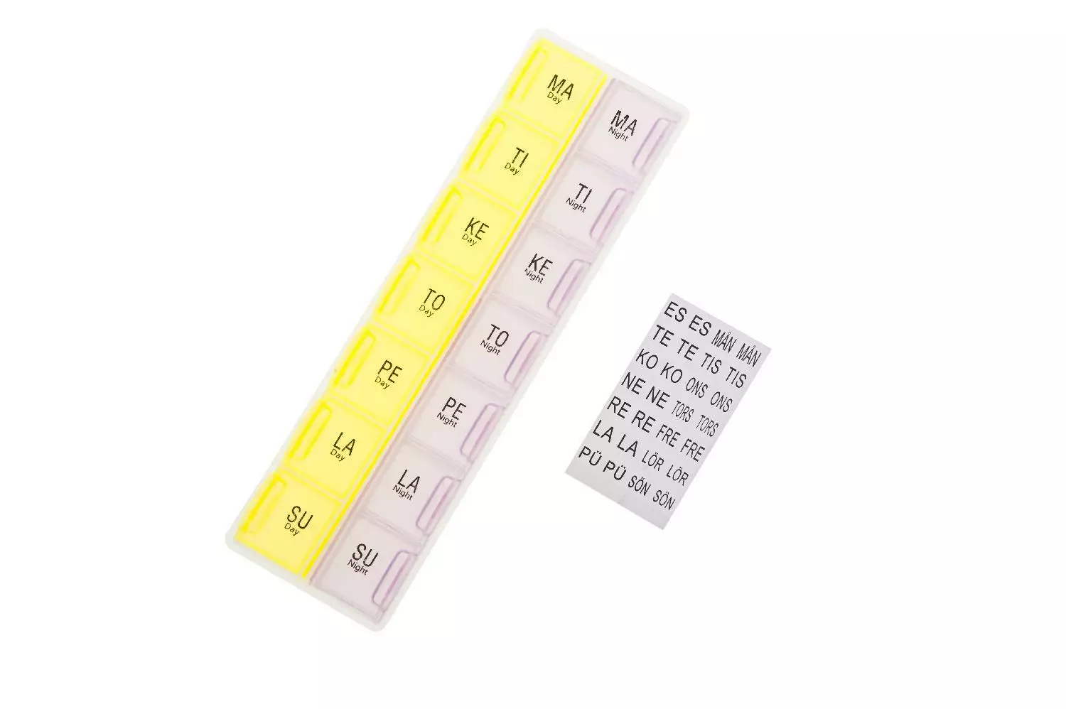 Kätevän kokoinen lääkeannostelija viikon ilta- ja aamu lääketarpeeseen. Erinomainen esimerkiksi matkoilla. Helppo täyttää ja käyttää.