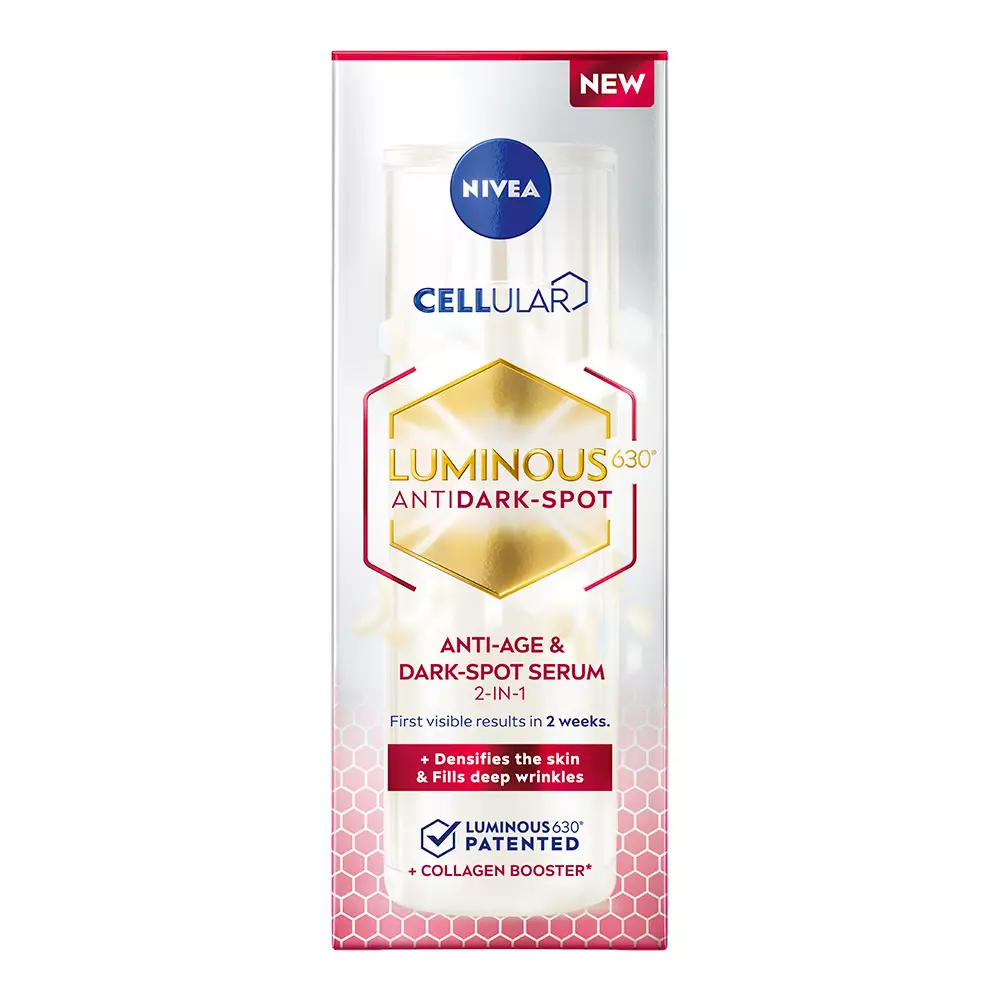 NIVEA Cellular Luminous630 Anti-Age & Dark-Spot Serum -kasvoseerumi tasapainottaa pigmentaatiota solutasolla vähentääkseen pigmenttiläiskiä ja ehkäistäkseen niiden uudelleenmuodostumista. Vähentää 10 vuoden aikana kertyneitä ikääntymisen aiheuttamia pigmenttiläiskiä* antaen ensimmäiset näkyvät tulokset 2 viikossa. Tehokas koostumus sisältää patentoitua Luminous630-ainesosaa sekä luonnollista soijauutetta. Seerumi vahvistaa ja kiinteyttää ihoa sekä täyttää jopa syviä ryppyjä. Hellävarainen iholle, sopii kaikille ihotyypeille, myös herkälle iholle. Iholle sopivuus dermatologisesti hyväksytty. *Itsearvio, 42 vapaaehtoista henkilöä, 12 viikon tutkimus, 2022.Käyttö: Käytä kahdesti päivässä, aamulla & illalla, puhdistetuille kasvoille ennen päivittäistä ihonhoitorutiiniasi. Käytä Luminous630-ainesosaa sisältäviä kasvojenhoitotuotteita enintään 4 kertaapäivässä. Vältä tuotteen joutumista silmiin.