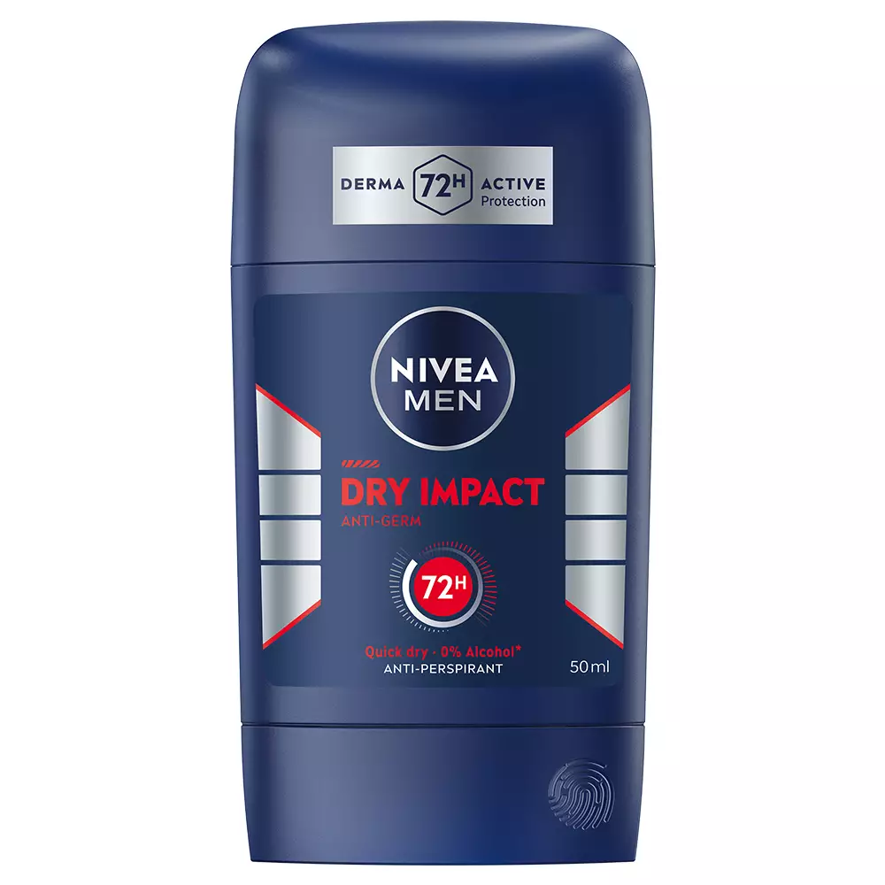 NIVEA MEN Dry Impact Deo Stick -antiperspirantti antaa tehokkaan ja luotettavan 72 tunnin antiperspiranttisuoja, joka hoitaa ihoa. Kaksivaikutteinen koostumus sisältää kaksi antibakteerista vaikuttavaa ainetta ja 0% etyylialkoholia, antaa iholle miellyttävän ja kuivan tunteen. Miellyttävä, raikas tuoksu. Dermatologisesti testattu.