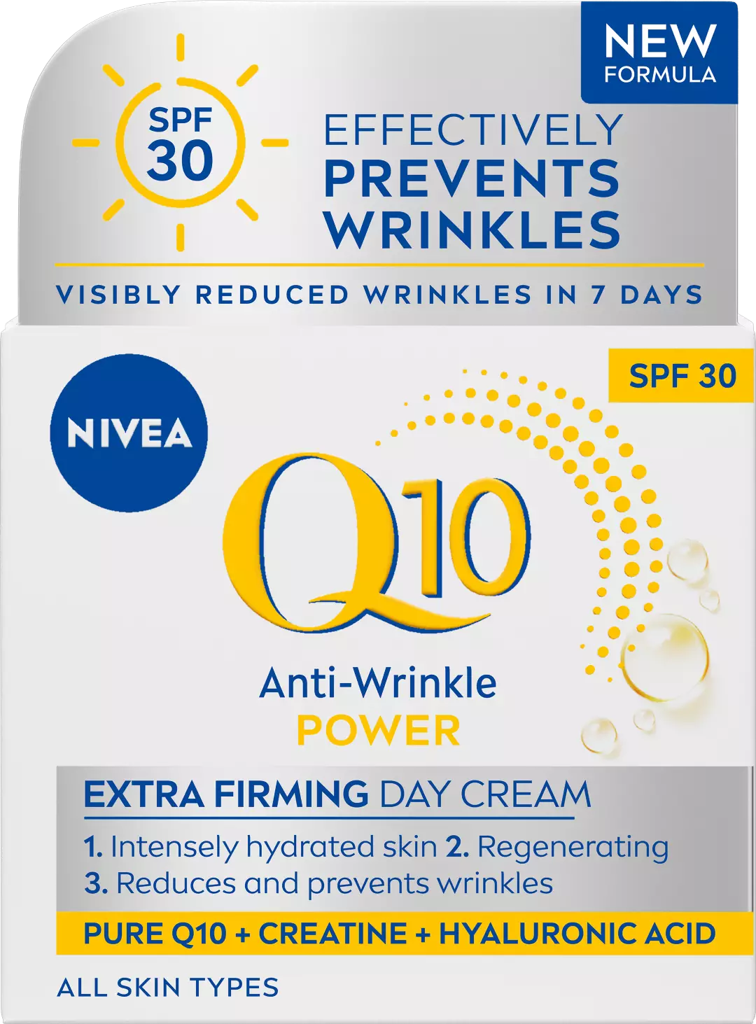 NIVEA Q10 Anti-Wrinkle Power Extra Firming Day Cream SK30 -päivävoide sisältää puhdasta Q10:ntä, joka antaa ihosoluille energiaa ja korjaa ryppyjä sisältäpäin*, kreatiinia, joka tehostaa kollageenin ja elastiinin tuotantoa* ja tekee ihosta kiinteämmän, sekä hyaluronihappoa, joka täyttää ihon kosteudella ja sitoo kosteutta ihoon. Suojakerroin SK 30 ja UVA/UVB-suodattimet suojaavat kasvojen herkkää ihoa UV-säteiden aiheuttamilta vanhenemisen merkeiltä. Ehkäisee UV-säteilystä peräisin olevia vaurioita, jotka aiheuttavat ryppyjä. Tehokkuus kliinisesti todistettu. Kasvovoide sopii kaikille ihotyypeille. Dermatologisesti testattu.Huikeat tulokset:Iho on tehokkaasti kosteutettu 94% naisista 7 päivässä**Kiinteämpi iho 72%:lla naisista 7 päivässä**Vähentää ryppyjä 83%:lla naisista 7 päivässä***testattu ihosoluilla**tieteelliset tutkimukset ihon kiinteydestä ja kosteutuksesta. 30 naista, 2020.**itsearviointitutkimus, 46 naista, 2020.