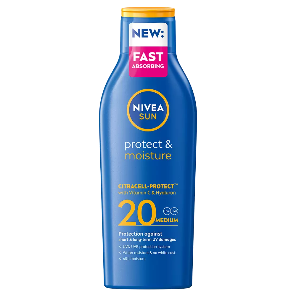 NIVEA SUN Protect & Moisture Sun Lotion SK20 -aurinkosuojavoide sisältää tehokkaita UVA- ja UVB-suodattimia, joiden suhde on ihon suojauksen kannalta optimaalinen. Suojakerroin 20. Antaa luotettavan ja pitkäkestoisen suojan palamiselta ja ehkäisee ihon ennenaikaista vanhentumista sekä aurinkoallergioita. Suojaa ihon terveyttä sekä ulkoa että sisältä antioksidantti E-vitamiinin avulla, joka kosteuttaa sekä suojaa ihoa ja sen luonnollista rakennetta. Vedenkestävä ja hoitava voide syväkosteuttaa tehokkaasti ja pitkävaikutteisesti sekä vahvistaa ihon omaa mikrobiomia. NIVEA SUN -tuotteilla voit olla huoletta auringolta suojattuna. Dermatologisesti testattu.-> Kosteuttaa ihoa tehokkaasti ja pitkäkestoisesti-> Auttaa ehkäisemään auringoallergian riskiä-> Erittäin tehokas UVA/UVB-suoja-> Suojaa välittömästi ihoa auringonpolttamilta ja ennenaikaiselta vanhenemiselta-> Vedenkestävä, ihon omaa mikrobiomia vahvistava koostumusHyväksi iholle, hyväksi ympäristölle!-> 84% biohajoava koostumus-> Vesistöjä kunnioittava koostumus ei sisällä Octinoxate-, Oxybenzone- ja Octocrylene- UV-suodattimia, eikä mikromuovia.-> 50% kierrätetystä muovista valmistettu pakkaus (pois lukien etiketti)Miksi auringolta suojautuminen on niin tärkeää?Auringolta suojaamisesta ei voi ikinä muistuttaa liikaa. Kukapa ei haluaisi nauttia kesästä, olla auringossa ja saada ihanan päivetyksen iholle, mutta se on hyvä tehdä turvallisesti. Auringolta kannattaa suojautua, sillä ihon palaminen altistaa ihosyöville. Iholle jää muistijälki jokaisesta palamisesta ja se vaurioituu säteilystä pikkuhiljaa vuosien saatossa. UV-säteily myös vanhentaa ja kuivattaa ihoa sekä altistaa maksaläiskille. Riittävällä suojautumisella eli vaatteilla, suojakerrointuotteilla ja aurinkolaseilla pystymme viettämään aikaa auringossa turvallisin mielin.Miten vedenkestävä määritellään?Euroopassa vedenkestävyyden testaukseen on olemassa vain yksi hyväksytty standardi, jonka on hyväksynyt Cosmetics Europe (kosmetiikka-alan yläorganisaatio). Tämän standardin mukaisesti kaikki vedenkestävät aurinkosuojatuotteemme on testattu ulkopuolisissa, itsenäisissä laitoksissa ja ne ovat läpäisseet vedenkestävyyden kriteerit. Testikäyttäjät kylpevät 2x20 min (vedenkestävä) tai 4x20 min (erittäin vedenkestävä) tuotteen käytön jälkeen, minkä jälkeen jäljelle jääneen aurinkosuojan tulee olla yli 50 % alkuperäisestä arvosta. Vedenkestävyys ei siis tarkoita sitä, että alkuperäinen aurinkosuoja kestää rajoittamattoman ajan.