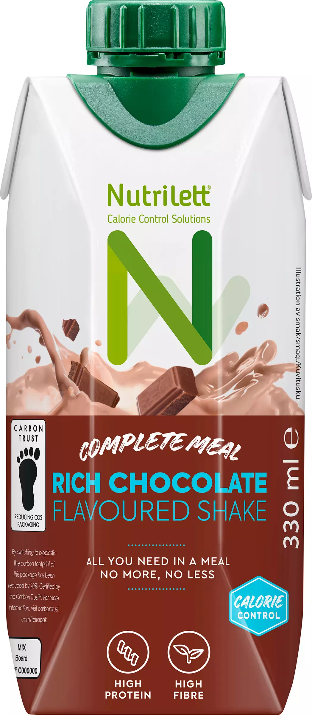 Nutrilett Rich Chocolate Flavoured drink on suklaanmakuinen, herkullinen ateriankorvike. Nutrilett -juomat ovat tehokkaita ja toimivia tuotteita painonhallintaan ja -pudotukseen. Kahden pääaterian korvaaminen päivässä ateriankorvikkeella vähäenergiaisen ruokavalion yhteydessä auttaa painonpudotuksessa ja yhden pääaterian korvaaminen auttaa ylläpitämään painoa painonpudotuksen jälkeen. Ateriankorvikkeet sisältävät runsaasti proteiinia, välttämättömät rasvahapot sekä vitamiineja ja kivennäisaineita vähintään kolmasosan päivän saantisuosituksesta. Tuote on runsaskuituinen ja vähälaktoosinen. Tuotteessa käytetty kaakao on Rainforest Alliance -sertifioitu. Tuotteen tetrapakkaus on valmistettu 72 % kasviperäisestä materiaalista ja korkki on sokeriruokoa.