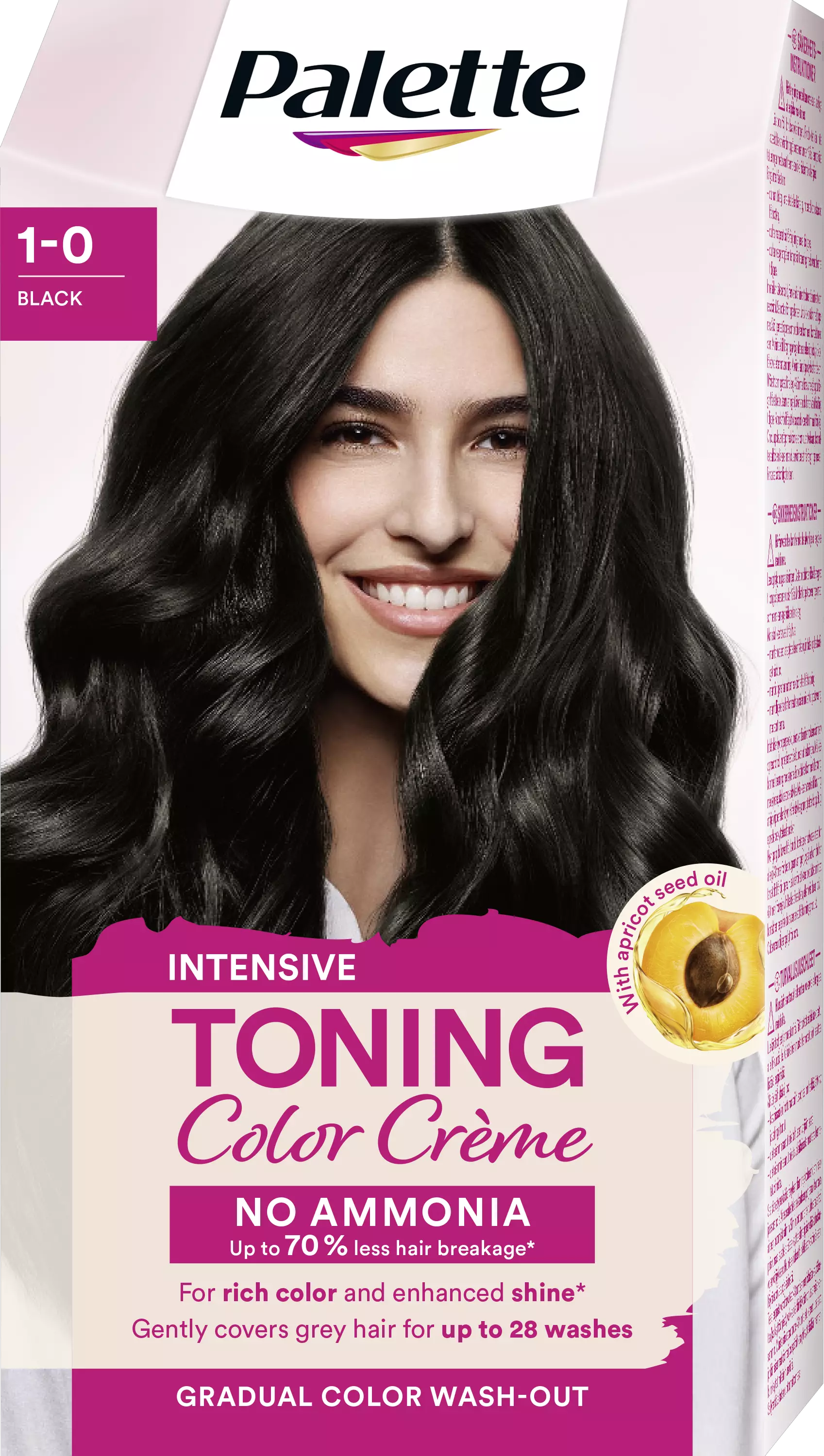 Palette Intensive Toning Color Crème 1-0 Black Demi-permanent - Ammoniakiton hiusväri, joka peittää hellävaraisesti harmaat hiukset ja kestää jopa 28 pesukertaaOn aika loistaa! Nauti kirkkaista väreistä luonnollisella kiillolla! Tämä ammoniakiton sävyteväri antaa intensiivisen värin, joka huuhtoutuu vähitellen pois, jotta näkyvä tyvikasvu on mahdollisimman vähäistä luonnollisten ja värjättyjen hiusten välillä. Täyteläinen väritulos hellävaraisella harmaiden hiusten peitolla. Hemmottele itseäsi ammoniakittomalla koostumuksella, joka vähentää hiusten katkeilua jopa 70 %*, ja hoitoaine antaa hiuksillesi säteilevän kiillon. Hiusvärin koostumuksessa on luonnollista alkuperää olevaa aprikoosinsiemenöljyä ja vegaanista keratiinia. Tässä hoitavassa hiusvärissä on jopa 94 %** luonnollista alkuperää olevia ainesosia. Koostumus on vegaaninen***, eikä siinä ole ammoniakkia tai silikoneja. Ohjelehtinen ja alumiiniputki voidaan kierrättää. Taitettava laatikko on FSC-sertifioitu.Miellyttävä levittää: Ei sotkua, vain hauskanpitoa – Palette-hiusväri ei valu, on hellävarainen hiuksille, helppo sekoittaa sen kevyen koostumuksen ansiosta ja se tarvitsee vain 30 minuuttia vaikutusaikaa hiuksissa. Tämä musta hiusväri sopii keskiruskeista hiuksista mustiin hiuksiin ja jopa 30-prosenttisesti harmaantuneille hiuksille. Mainitsimmeko, että siinä on myös mukavan hedelmäinen tuoksu?Jos sinulla on yli leuan ulottuvat hiukset tai paksut hiukset, suosittelemme käyttämään kaksi pakkausta.Tuotteen hyödyt yhdellä silmäyksellä:Ammoniakiton hiusväri1-0 MustaKestää jopa 28 pesua/ 8 viikkoaHoitaa hiuksia ja antaa niille kiiltoa*Tasainen tyvikasvuMiellyttävä levittää* verrattuna käsittelemättömiin hiuksiin** mukaan lukien vesi*** ei eläinperäisiä ainesosia
