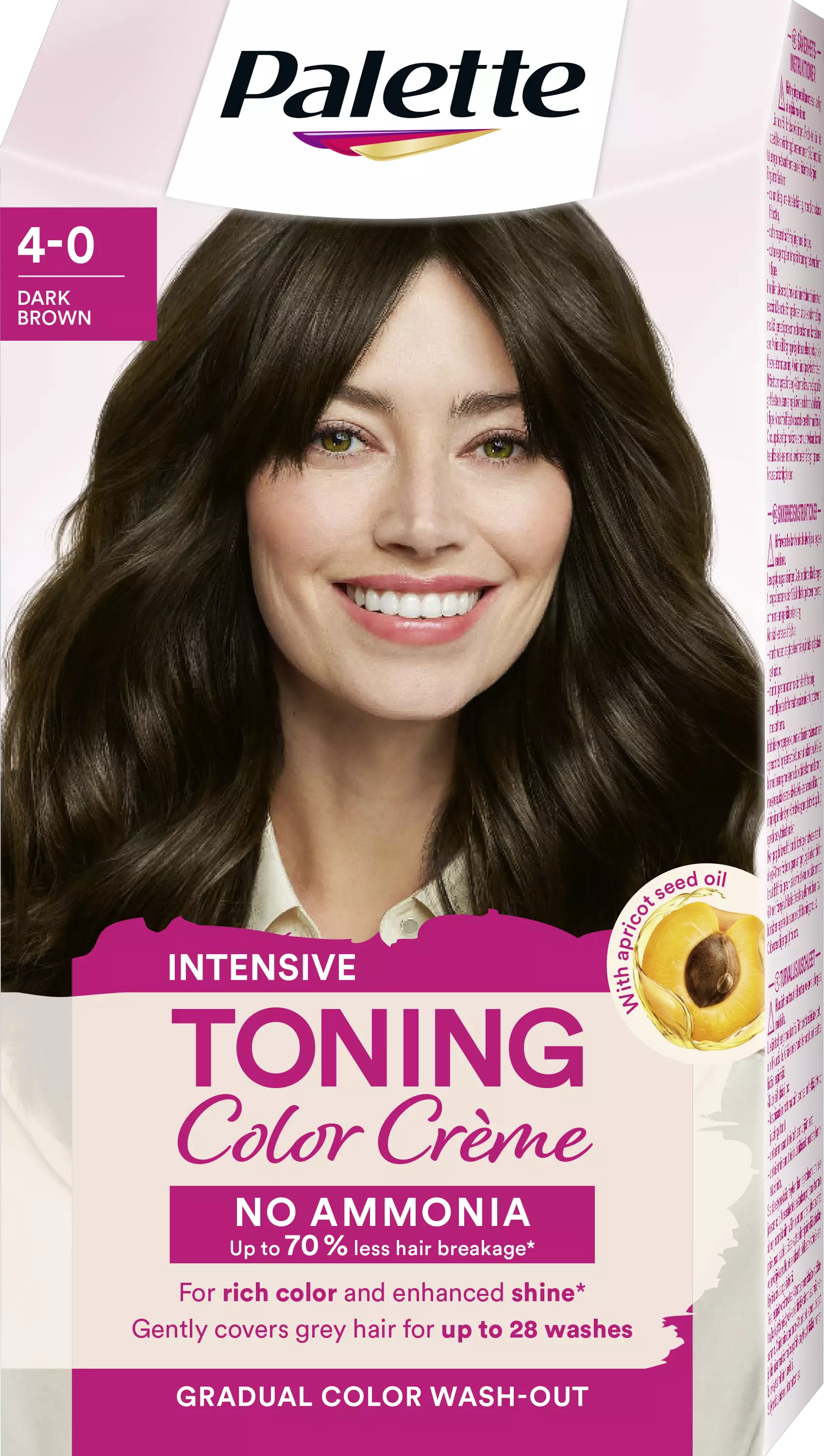 Palette Intensive Toning Color Crème 4-0 Dark Brown Demi-permanent - Ammoniakiton hiusväri, joka peittää hellävaraisesti harmaat hiukset ja kestää jopa 28 pesukertaaOn aika loistaa! Nauti kirkkaista väreistä luonnollisella kiillolla! Tämä ammoniakiton sävyteväri antaa intensiivisen värin, joka huuhtoutuu vähitellen pois, jotta näkyvä tyvikasvu on mahdollisimman vähäistä luonnollisten ja värjättyjen hiusten välillä. Täyteläinen väritulos hellävaraisella harmaiden hiusten peitolla. Hemmottele itseäsi ammoniakittomalla koostumuksella, joka vähentää hiusten katkeilua jopa 70 %*, ja hoitoaine antaa hiuksillesi säteilevän kiillon. Hiusvärin koostumuksessa on luonnollista alkuperää olevaa aprikoosinsiemenöljyä ja vegaanista keratiinia. Tässä hoitavassa hiusvärissä on jopa 94 %** luonnollista alkuperää olevia ainesosia. Koostumus on vegaaninen***, eikä siinä ole ammoniakkia tai silikoneja. Ohjelehtinen ja alumiiniputki voidaan kierrättää. Taitettava laatikko on FSC-sertifioitu.Miellyttävä levittää: Ei sotkua, vain hauskanpitoa – Palette-hiusväri ei valu, on hellävarainen hiuksille, helppo sekoittaa sen kevyen koostumuksen ansiosta ja se tarvitsee vain 30 minuuttia vaikutusaikaa hiuksissa. Tämä musta hiusväri sopii keskiruskeista hiuksista mustiin hiuksiin ja jopa 30-prosenttisesti harmaantuneille hiuksille. Mainitsimmeko, että siinä on myös mukavan hedelmäinen tuoksu?Jos sinulla on yli leuan ulottuvat hiukset tai paksut hiukset, suosittelemme käyttämään kaksi pakkausta.Tuotteen hyödyt yhdellä silmäyksellä:Ammoniakiton hiusväri4-0 TummanruskeaKestää jopa 28 pesua/ 8 viikkoaHoitaa hiuksia ja antaa niille kiiltoa*Tasainen tyvikasvuMiellyttävä levittää* verrattuna käsittelemättömiin hiuksiin** mukaan lukien vesi*** ei eläinperäisiä ainesosia
