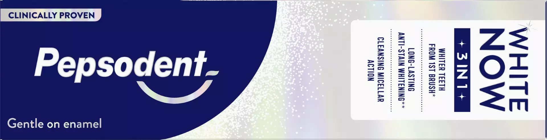 Uusi Pepsodent White Now 3in1 -hammastahna tekee hampaista välittömästi valkoisemmat ja antaa sinulle säteilevän hymyn heti ensimmäisellä harjauksella. Sen sisältämä Triple Light™ -teknologia auttaa tekemään hampaista valkoisemmat kolmivaikutteisesti, samalla kun se on hellävarainen kiilteelle. Saa nyt upea hymysi takaisin!Pepsodent White Now 3in1 -hammastahnan kolmivaikutteinen vaikutus perustuu kolmeen toimintoon: 1) Hammastahnan optinen Blue-Sapphire-teknologia muodostaa hampaiden pinnalle ohuen sinisen kalvon, jonka vaikutuksesta hampaiden väri korjaantuu välittömästi. Näin hampaista tulee valkoisemmat heti ensimmäisellä harjauskerralla*. 2) Hammastahna poistaa pinttyneet tahrat hampaista pitkäkestoisesti** ja tekee näin hampaista valkoisemmat vain kolmessa päivässä. Lisäksi se tarjoaa hampaille pitkävaikutteisen suojan tahroja vastaan. 3) Hammastahnan runsas vaahto ja misellipuhdistus poistaa epäpuhtaudet hellästi ja on samalla hellävarainen kiilteelle. Lopputuloksena on raikas suu ja valkoisemmat hampaat!Pepsodent White Now 3in1 hammastahna sisältää 96 % luonnollista alkuperää olevia ainesosia ja sen on kliinisesti todistettu olevan hellävarainen kiilteelle, samalla kun se tekee hampaista valkoisemmat. Samasta sarjasta löydät myös Pepsodent White Now Hello Glow -hammastahnan, joka tekee hampaistasi ihanan puhtaat ja valkoisemmat.Me Pepsodentillä uskomme, että hymysi ilmentää persoonallisuuttasi ja itseluottamustasi. Suun terveys on meille tärkeää ja tavoitteenamme onkin parantaa hampaiden ja suun terveyttä kaikilla, jotta jokainen meistä voi hymyillä vapaasti. Vuodesta 1961 lähtien Pepsodent on pyrkinyt opettamaan ihmisille oikeita käytäntöjä hampaiden pesuun jo varhaisesta iästä lähtien ja osoittamaan, miten tärkeää on harjata hampaat kahdesti päivässä aamuin ja illoin. Myös maapallon suojelu on meille sydämen asia ja pyrimme rajoittamaan tuotteidemme ympäristövaikutuksia.*Valkoisuuden vaikutelma on väliaikainen. Kliininen tutkimus, jossa tutkittiin välitöntä valkoisuuden vaikutelmaa. Vertailussa oli tavallinen fluorihammastahna ja 54 osanottajaa.**Säännöllisesti käytettynä kahdesti päivässä 2 viikon ajan. Kliininen testi, jossa 59 osanottajaa.