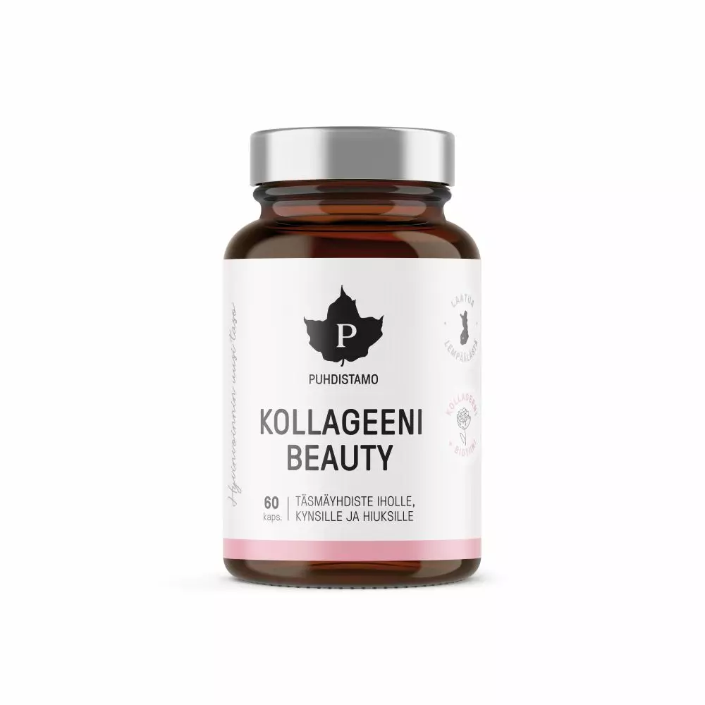 Puhdistamon Kollageeni Beauty -kapseli on maailman tutkituimman VERISOL® -kollageenipeptidin, C-vitamiinin, Tripla Sinkin™ sekä biotiinin täsmäyhdistelmä kauneudenhoitoon kätevässä kapselimuodossa. Tuotteen sisältämä C-vitamiini tehostaa kehon omaa kollageenituotantoa, sinkki vahvistaa kynsiä ja biotiini huolehtii ihon sekä hiusten kunnosta. Kehitetty ja valmistettu Suomessa.