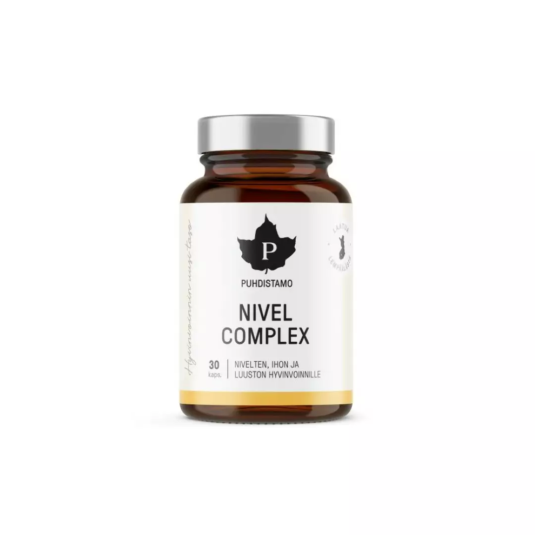 Puhdistamon Nivel Complex on täsmätuote nivelten hyvinvoinnille. Sen sisältämä C-vitamiini tukee luonnollista kollageenin muodostumista. C-vitamiini ja mangaani edistävät luuston pysymistä normaalina. Mangaani lisäksi vahvistaa sidekudoksen normaalia muodostumista. UC-II® on patentoitu, kliinisesti testattu denaturoitumaton kollageeni. Mukana kokonaisuutta täydentämässä on myös kurkuma.