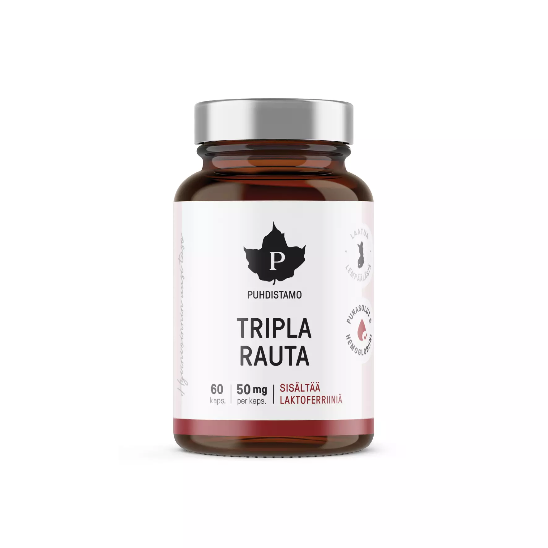 Puhdistamon Tripla Rauta on vahva ja monipuolinen rautavalmiste. Se sisältää kahta korkealaatuista raudan muotoa: rautabisglysinaattia ja ferrofumaraattia. Kolmantena komponenttina tuotteessa on mukana rautaa elimistössä kuljettavaa laktoferriiniä, joka sisältää myös itsessään hieman rautaa. Tuotteen C-vitamiini lisää entisestään raudan imeytymistä. Rauta auttaa muun muassa vähentämään väsymystä ja uupumusta, sekä edistää normaalia punaisten verisolujen ja hemoglobiinin muodostumista. Tripla Rauta on hellävarainen vatsalle ja imeytyy erinomaisesti.