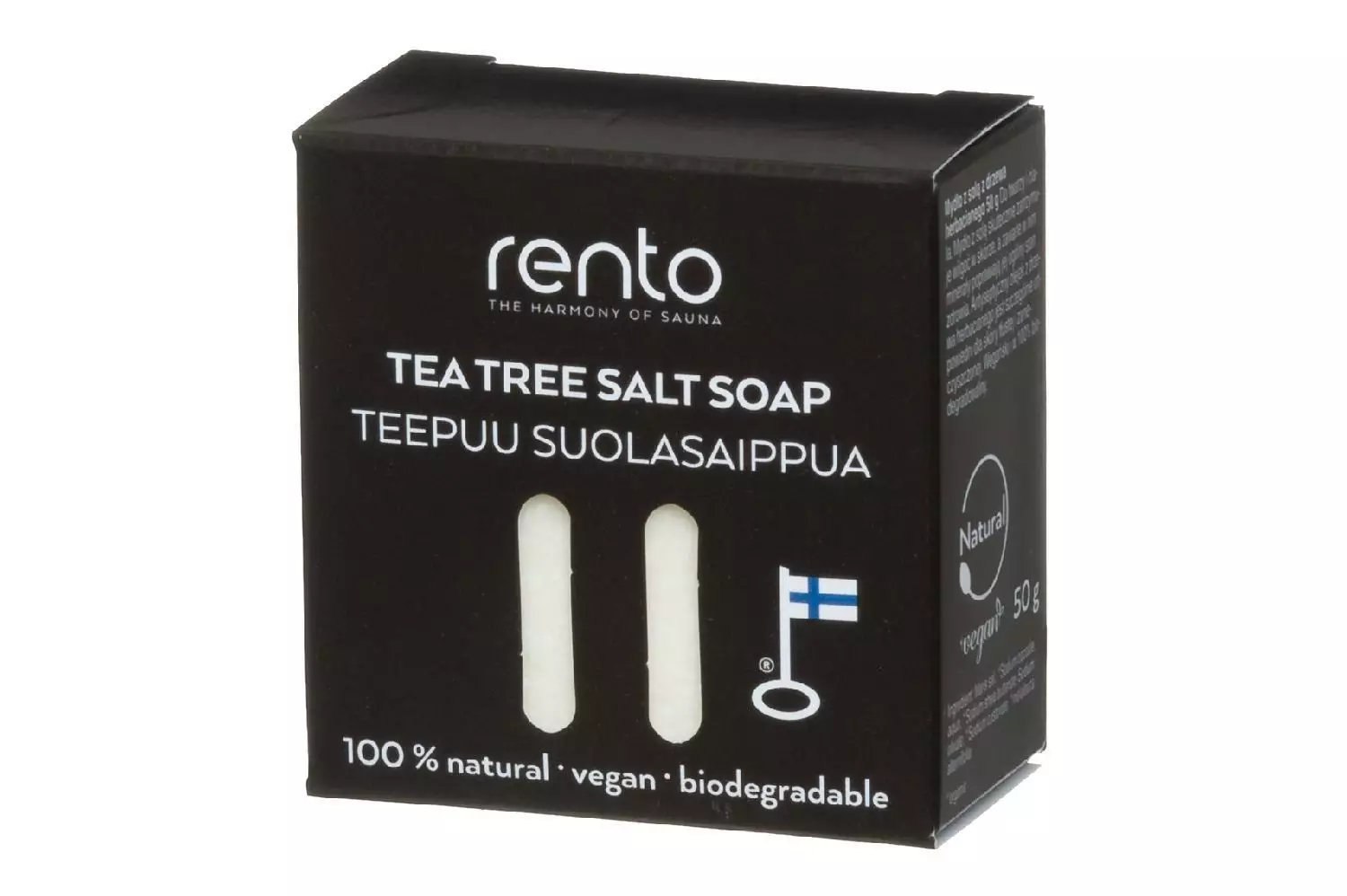Luonnollinen ja hellävarainen, käsin tehty suolasaippua niin kasvojen kuin vartalon pesuun. Suola on antiseptinen ja sopii paitsi puhdistamaan epäpuhtauksia, myös poistamaan tehokkaasti hien hajua. Teepuuöljyä sisältävä suolasaippua sopii erityisesti rasvoittuvalle iholle ja sekaiholle. Sen antibakteeriset ominaisuudet auttavat neutraloimaan epäpuhtauksia. Tuoksuttomana tämä suolasaippua soveltuu hajusteyliherkille, eikä se sisällä allergisoivia ainesosia. Suolasaippuan ominaisuuksiin kuuluu kosteuden sitominen, eli se kosteuttaa ihoa tehokkaasti samalla kun suolan mineraalit parantavat ihon yleistä hyvinvointia. Rento suolasaippua sisältää ainoastaan luonnon omia raaka-aineita eikä yhtään keinotekoisia väriaineita, hajusteita taikka kemikaaleja. Saippuassa on tallella kylmäprosessimenetelmässä luonnostaan saippuaan muodostuva glyseriini, jolla on ihoon kosteutta vetävä vaikutus. Suolasaippuassa on myös ns. ylirasvoitusta, jolloin saippuoitumisprosessissa osa öljyistä jää saippuaan hellimään ja hoitamaan ihoa. Ei lisättyjä tuoksuja. Vegaaninen ja 100 % biohajoava. Valmistettu Suomessa, Avainlippumerkki.