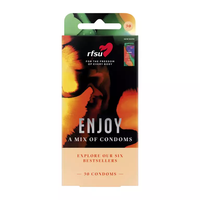Jännittävä sekoitus kondomeja! RFSU Enjoy sopii kaikille, jotka haluavat tuntea ja kokeilla uusia asioita tai jotka etsivät vain vaihtelua. Pakkauksen lateksikondomeissa on erilaisia istuvuuksia, ohuutta, rakennetta ja aromia voiteluaineessa.
