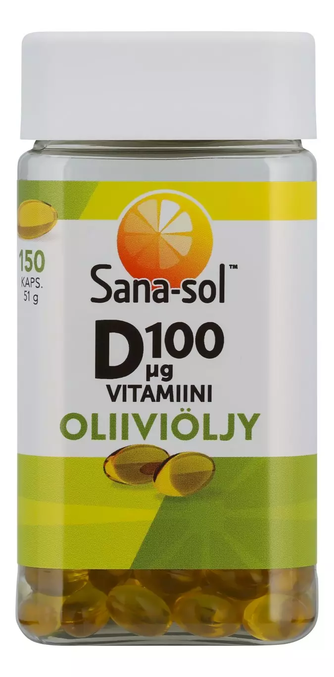 Sana-sol D-vitamiinikapseli Oliiviöljy 100 ?g on vahva D-vitamiinivalmiste, joka sisältää hyvin imeytyvää D3-vitamiinia ekstraneitsytoliiviöljyssä. Pienet kapselit on helppo niellä. D-vitamiini toimii luuston hyväksi, sillä se edistää kalsiumin imeytymistä. D-vitamiini edistää immuunijärjestelmän ja lihasten normaalia toimintaa. Laktoositon ja gluteeniton. Suositeltava vuorokausiannos aikuisille 1 kapseli vuorokaudessa. Purkki on valmistettu osittain kierrätysmuovista. Kierrätä muovina. Ravintolisä ei korvaa monipuolista ja tasapainoista ruokavaliota eikä terveitä elämäntapoja.