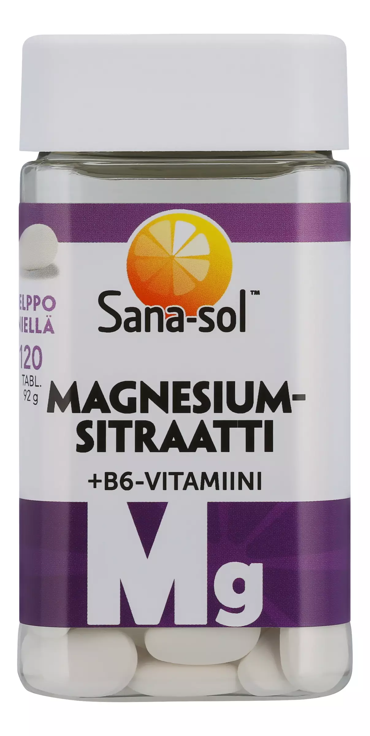 Sana-sol Magnesium sisältää hyvin imeytyvää magnesiumia sitraattimuodossa sekä B6-vitamiinia. Magnesium edistää lihasten ja luuston normaalia toimintaa ja tukee myös elektrolyyttitasapainoa.Tabletti on mantelinmuotoinen, minkä vuoksi tabletti on helpompi niellä kuin pyöreä tabletti. Tablettimuoto on kliinisesti testattu. Laktoositon ja gluteeniton. Ei sisällä eläinperäisiä ainesosia. Sopii vegaaneille. Purkki on valmistettu osittain kierrätysmuovista. Kierrätä muovina. Ravintolisä ei korvaa monipuolista ja tasapainoista ruokavaliota eikä terveitä elämäntapoja.