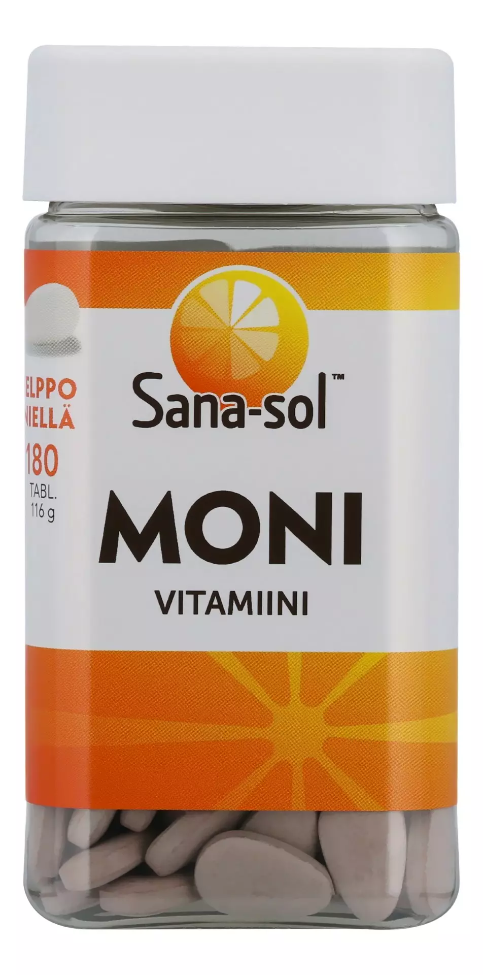 Sana-sol Monivitamiini-kivennäisainevalmiste on monipuolinen ravintolisä, joka sisältää 11 vitamiinia ja 9 kivennäisainetta. Monivitamiinin tabletti on mantelinmuotoinen, minkä vuoksi tabletti on helpompi niellä kuin pyöreä tabletti. Tablettimuoto on kliinisesti testattu. A-vitamiini edistää näön pysymistä normaalina. C- ja E-vitamiini auttavat solujen suojaamista hapettumisstressiltä. D-vitamiini edistää luuston toimintaa. Foolihappo ja B12-vitamiini auttavat vähentämään väsymystä ja uupumusta. Laktoositon ja gluteeniton. Suositeltava vuorokausiannos 1 tabletti vuorokaudessa. Purkki on valmistettu osittain kierrätysmuovista. Kierrätä muovina. Ravintolisä ei korvaa monipuolista ja tasapainoista ruokavaliota eikä terveitä elämäntapoja.