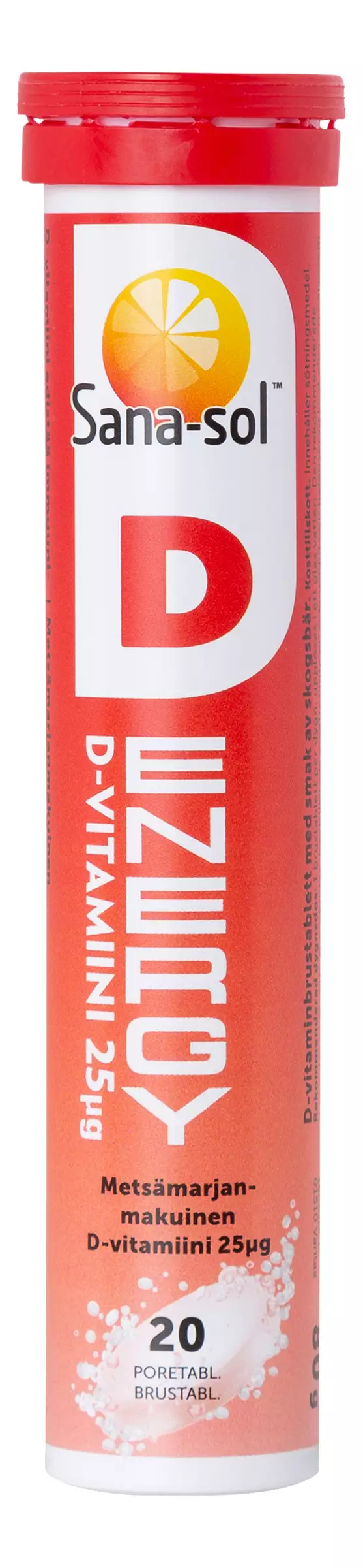 Sana-sol D-Energy on metsämarjanmakuinen D-vitamiiniporetabletti. 1 tabletti sisältää 25 µg vitamiinia. D-vitamiini edistää immuunisysteemin normaalia toimintaa. 1 poretabletti päivässä, liuotetaan lasilliseen vettä. Ravintolisä ei korvaa monipuolista ja tasapainoista ruokavaliota eikä terveitä elämäntapoja.