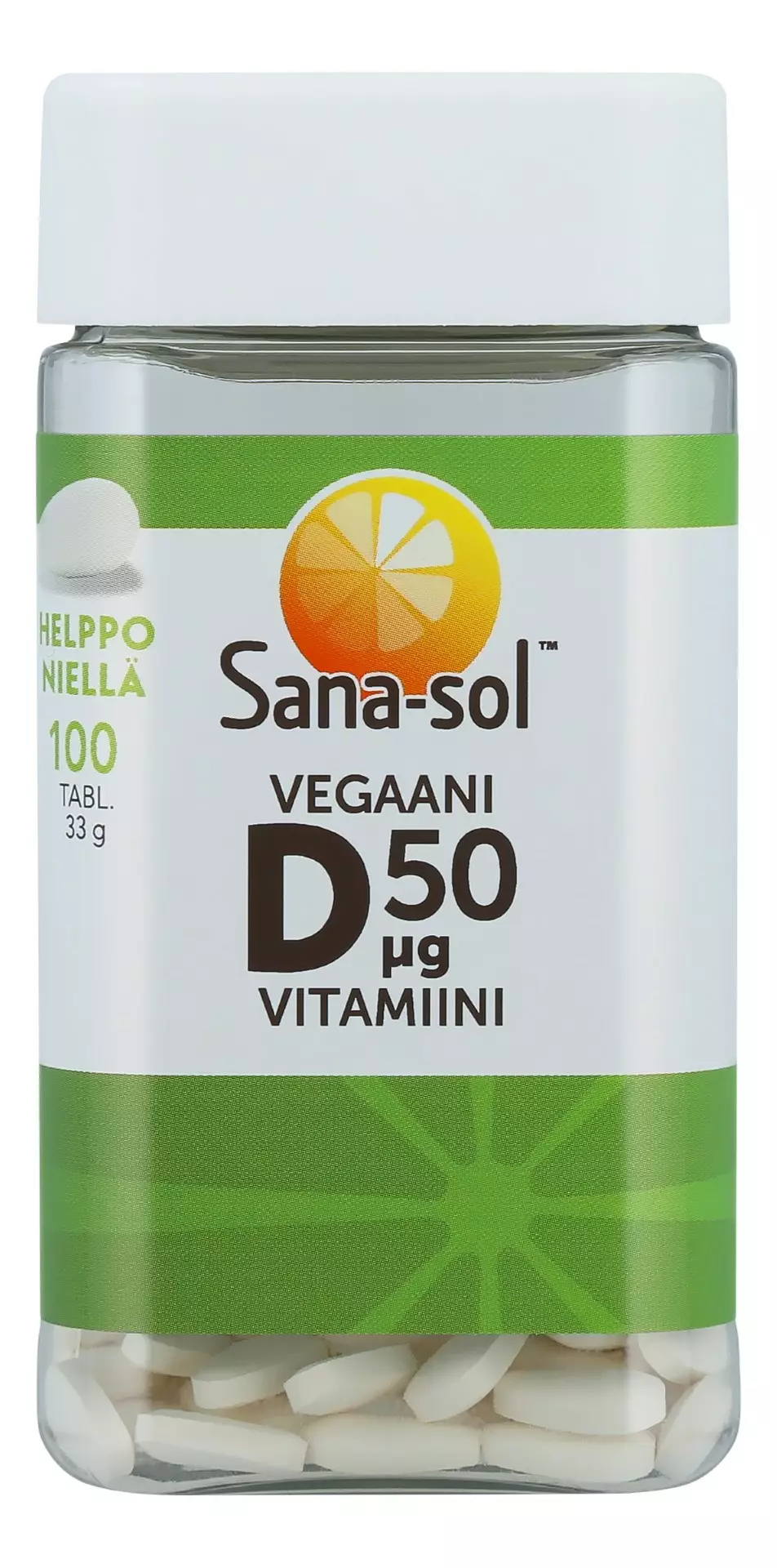 Sana-sol Vegaani D-vitamiini 50 ?g on D3-vitamiinivalmiste, joka sopii erityisesti vegaaneille ja kasvissyöjille. Sana-sol Vegaani D-vitamiini sisältää kasviperäistä D3-vitamiinia levästä. Tabletti on mantelinmuotoinen, minkä ansiosta tabletti on helpompi niellä kuin tavallinen, pyöreä tabletti. D-vitamiini toimii luuston hyväksi, sillä se edistää kalsiumin imeytymistä. D-vitamiini edistää immuunijärjestelmän ja lihasten normaalia toimintaa. Tuote on laktoositon ja gluteeniton. Suositeltava vuorokausiannos 1 tabletti vuorokaudessa. Purkki on valmistettu osittain kierrätysmuovista. Ravintolisä ei korvaa monipuolista ja tasapainoista ruokavaliota eikä terveitä elämäntapoja.