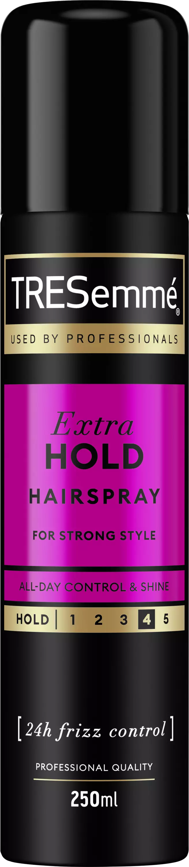 TRESemmé Extra Hold hiuskiinteen avulla viimeistelet kampauksesi kuin ammattilainen. TRESemmé Extra Hold tarjoaa salonkitason viimeistelyä hiuksillesi kätevässä 100 ml matkapakkauskoossa. Extra Hold on hiuskiinne, joka kuivuu nopeasti ja antaa kampauksellesi pitoa, joka kestää joka kahden vuorokauden ajan. Tämä hiuslakka pitää lentelevät irtohiukset kurissa ja varmistaa parhaan mahdollisen, mutta kuitenkin joustavan pidon. Nauti helposti hallittavasta kampauksesta, joka pysyy upeana joka säässä, sillä hiuskiinne suojaa kampaustasi myös kosteudelta.Näin käytät TRESemmé Extra Hold -hiuskiinnettä:1. Ota kuivia hiuksia pieni osa kerrallaan ja suihkuta niihin hiuslakkaa noin 25–30 cm:n etäisyydeltä (lähempää suihkutettuna kiinne jättää hiukset kosteiksi).2. Kun kaipaat voimakkaampaa pitoa, älä suihkuta valmistetta lähempää, vaan lisää useita kerroksia haluamiisi kohtiin.3. Saat täydellisen ilmavan ja kuohkean lookin kääntämällä pääsi alaspäin ja suihkuttamalla sitten hiuslakkaa hiuksiin kauttaaltaan.TRESemmén erityisosaaminen ammattitason hoito- ja muotoilutuotteissa tarkoittaa, että jokainen voi saavuttaa huipputuloksia kotonaan – ja luoda oman persoonallisen tyylinsä. Me TRESemméssä olemme aina uskoneet, että tyyli on tärkeä osa sinua. Joten kerro oma tarinasi, jätä jälkesi ja saavuta potentiaalisi – luo oma tyylisi.TRESemmé-tuotteiden taustalla on vuosien tutkimus- ja kehitystyö. Jokainen ainesosa on valittu tarkasti, jotta sinä voit huolehtia hiuksistasi parhaalla mahdollisella tavalla ja saat haluamasi lopputuloksen. Hoida hiuksiasi säännöllisesti TRESemmé Botanique -sarjan hiustenhoitotuotteilla. TRESemmén kaikki tuotteet ovat PETAn (People for the Ethical Treatment of Animals) hyväksymiä. PETA on maailman suurin eläinten oikeuksia puolustava järjestö. Voit siis luottaa siihen, että valitsemasi TRESemmé-tuotteen valmistuksessa ei ole käytetty eläinkokeita.