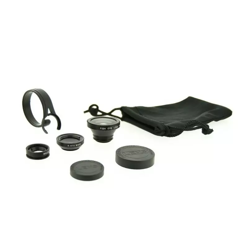 4-OK linssisetti, sisältää kolme linssiä: laajakuva, makro ja kalansilmä.