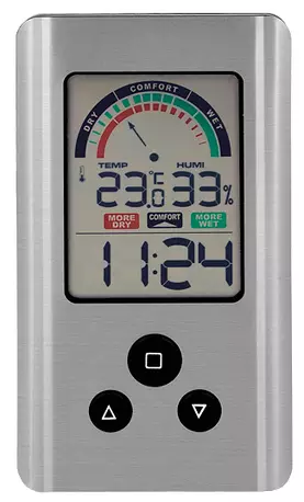 -iso LCD-näyttö -etukansi alumiinia -mitat 75 x 132 mm -mittausalueet --sisälämpötila -10°C - +60°C --ilmankosteus 10% - 99% -näytössä selkeät kuivan, optimaalisen ja märän ilmankosteuden... Lue lisää