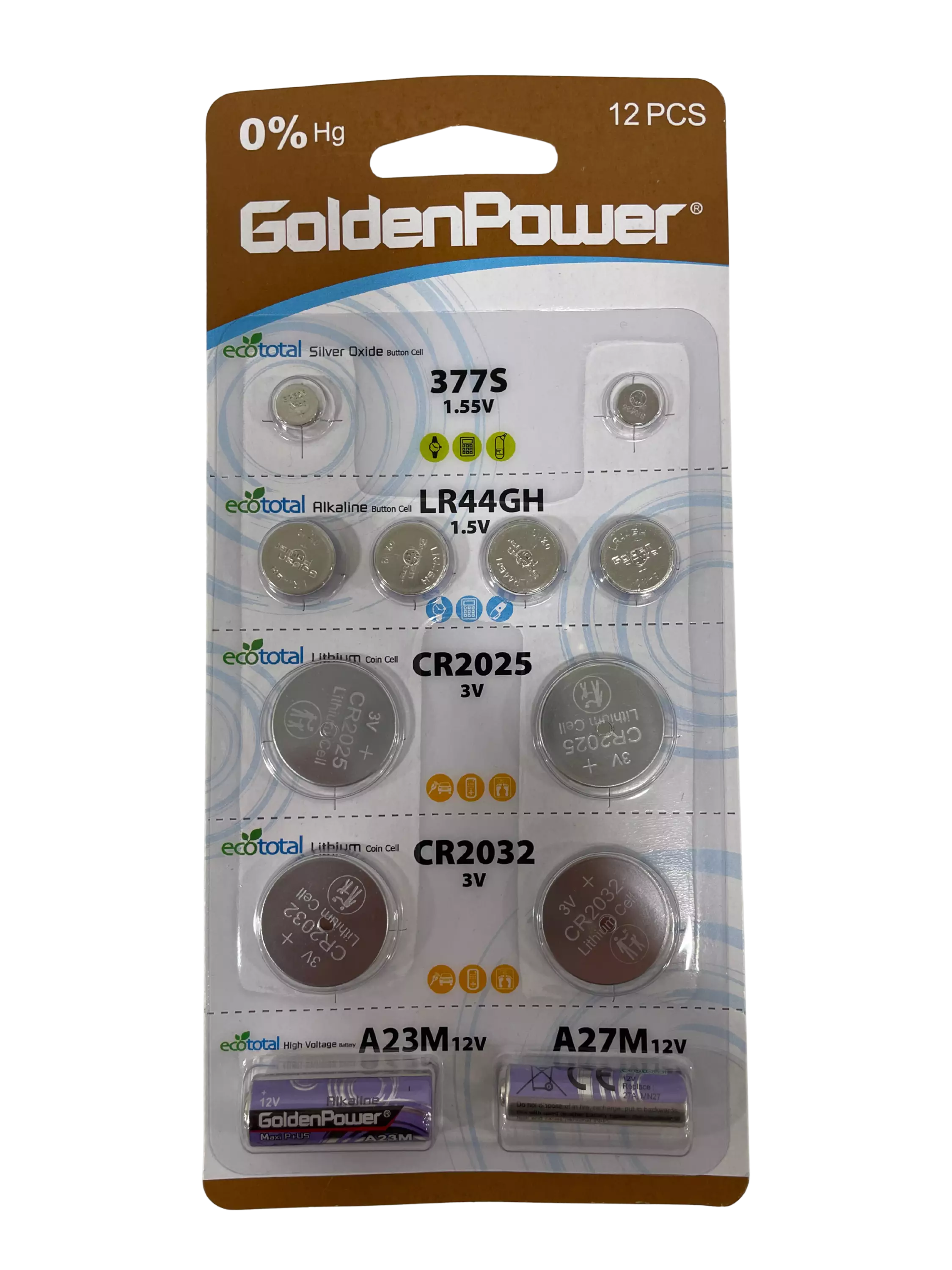 GoldenPower Paristolajitelma 12 kplGoldenPower Paristolajitelma sisältää useita yleisimpiä nappi- ja erikoisparistoja, jotka sopivat monenlaisiin kodin ja harrastusten laitteisiin. Tämä kattava pakkaus tarjoaa kätevän valikoiman eri kokoisia paristoja esimerkiksi kelloihin, kaukosäätimiin, laskimiin, autonavainkauko-ohjaimiin ja mittareihin.GoldenPowerin ecototal-sarjan paristot ovat elohopeattomia (0% Hg) ja valmistettu ympäristöä kunnioittaen. Korkealaatuinen valmistus takaa tasaisen virransyötön ja pitkän käyttöiän.Sisältö2 x 377S (1,55 V, Silver Oxide)3 x LR44GH (1,5 V, Alkaline)2 x CR2025 (3 V, Lithium)2 x CR2032 (3 V, Lithium)1 x A23M (12 V, High Voltage Alkaline)1 x A27M (12 V, High Voltage Alkaline)OminaisuudetYhteensä: 12 kplTeknologia: Silver Oxide, Alkaline ja LithiumElohopeaton: Kyllä, 0% HgSoveltuu: Kaukosäätimet, kellot, laskimet, mittarit, kamerat ja muut pienlaitteet