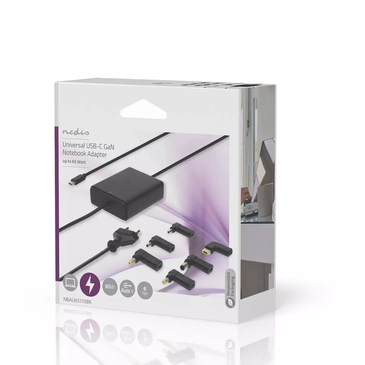 Nedis 65 W:n yleismallinen GaN kannettavan tietokoneen laturi on täydellinen kumppani kannettavalle tai minikannettavalle, jossa on USB-C-latausportti. Tämän laturin latauspään 90° kulma estää kaapelin taipumisen ja pienten mittojen vuoksi sovitin on ihanteellinen kumppani liikkeellä ollessasi. Se on 100% yhteensopiva kannettavan tietokoneen alkuperäisen laturin kanssa. Kannettavaan tietokoneeseen ladataan aina oikea määrä virtaa ennalta määritettyjen virransyöttöprofiilien ansiosta. Laturi kommunikoi kannettavan tietokoneen kanssa tehokkaimman latausprofiilin valitsemiseksi. Tämä mahdollistaa sovittimen käytön myös älypuhelimen tai tabletin lataamiseen USB-C-liitännällä.