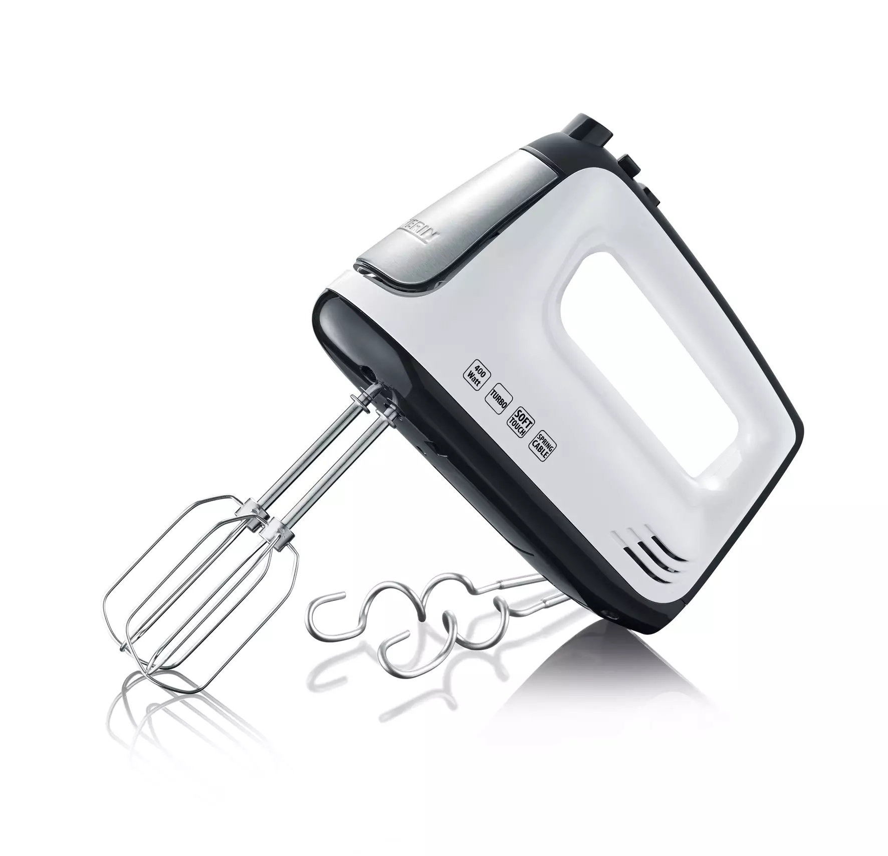 Teho: n. 400 W Viisi nopeutta Lisäksi turbovaihde Sekoitustyökalujen irrotuspainike Kaksi vispilää ja kaksi taikinakoukkua Takuu 2 vuotta