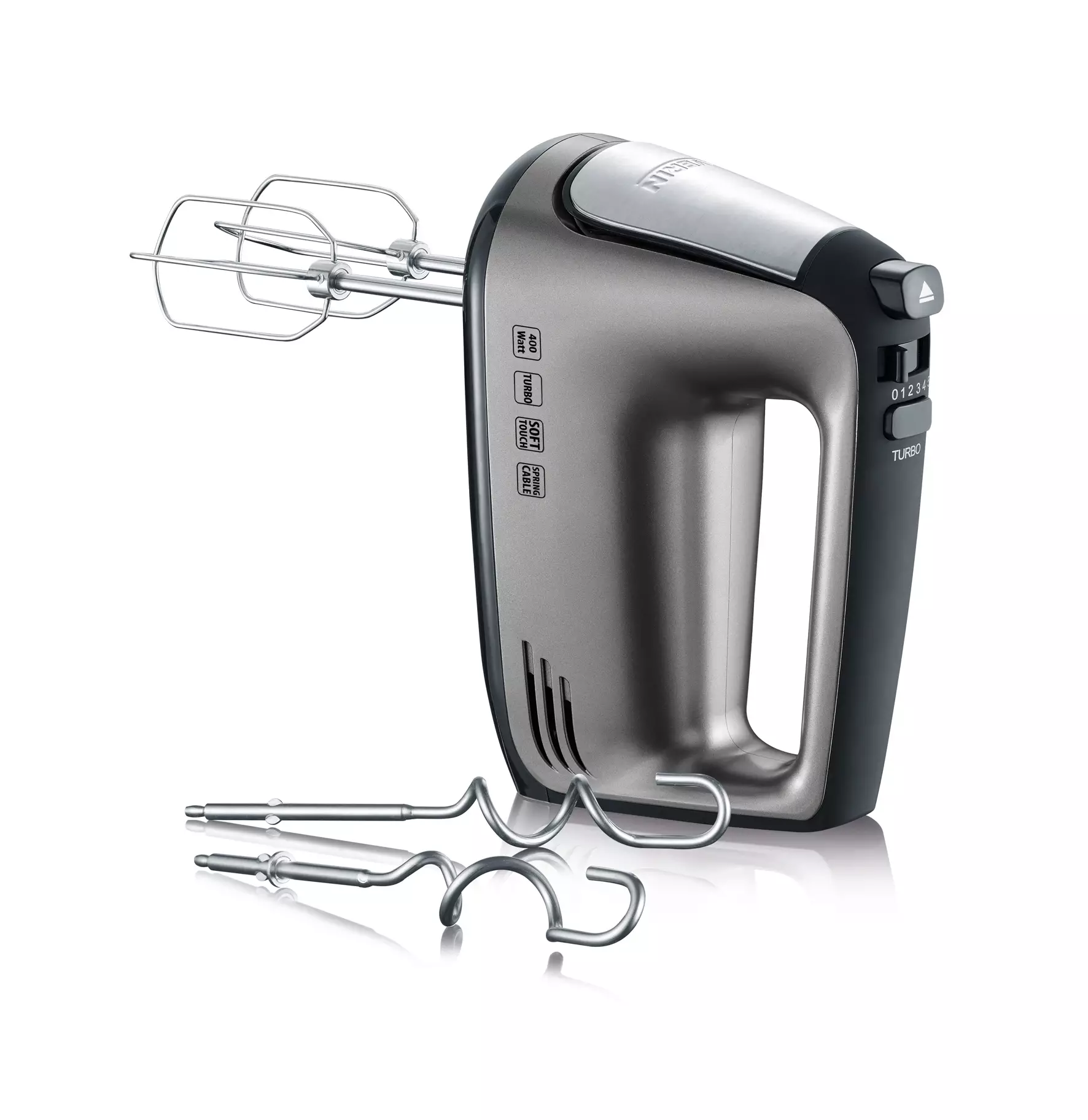 Teho: n. 400 W Viisi nopeutta Lisäksi turbovaihde Sekoitustyökalujen irrotuspainike Kaksi vispilää ja kaksi taikinakoukkua Takuu 2 vuotta