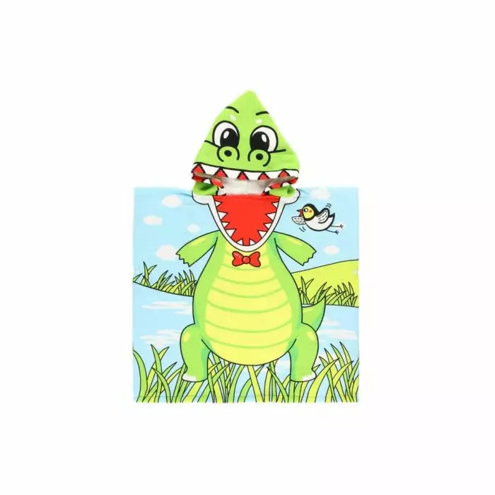 Värikäs hupullinen kylpyponcho on valmistettu pehmeästä mikrokuitumateriaalista. Helppo pukea, sivuilla nappikiinnitys. Hauska krokotiiliteema sekä edessä, että takana. Koko: 3-5-vuotiaalle. Vesipesu 60 astetta.