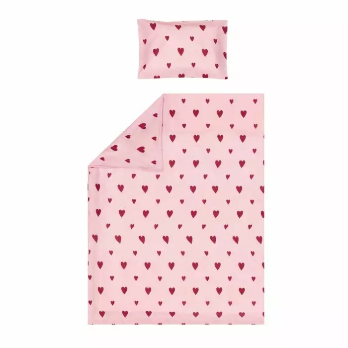 Sydänkuosinen pussilakanasetti, sis. pussilakanan 120 x 160 cm ja tyynyliinan 40 x 60 cm. Junior-koko sopii käytettäväksi standardikokoisen lasten peitteen (115 x 150 cm) ja tyynyn (40 x 60 cm) kanssa. Pesu 60 asteessa. Materiaali 100% puuvilla. Väri vaaleanpunainen-tummanpunainen. Pesu 60 asteessa. Tuotteella on Ökotex-sertifikaatti, mikä tarkoittaa että tuote on turvallinen eikä se sisällä haitallisia kemikaaleja.
