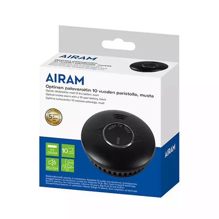 Musta optinen palovaroitin kiinteällä 10 vuoden 3 V litiumakulla. Sisäkäyttöön, kodin kuiviin ja pölyttömiin sisätiloihin. Kattoasennus mukana tulevalla kiinnityslevyllä.