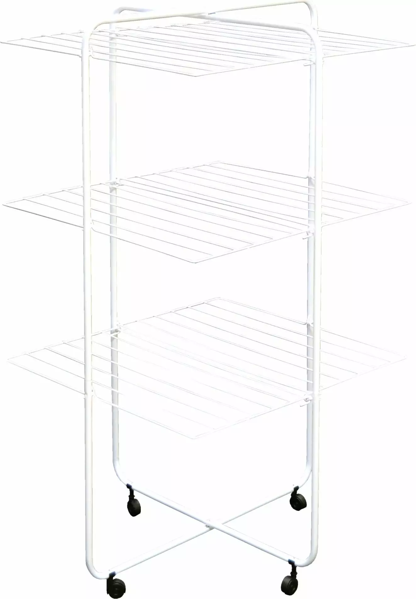 Tilava ja kätevä pyykinkuivausteline, joka tarjoaa runsaasti kuivaustilaa kolmella tasolla – yhteensä 26 metriä. Telineessä on rullat, joiden ansiosta sitä on helppo siirtää paikasta toiseen. Se on kokoontaitettava, joten se vie vain vähän tilaa säilytyksessä.Väri: valkoinenKokoontaitettuna mitat: korkeus 124 cm, leveys 72 cm ja syvyys vain 5 cm.