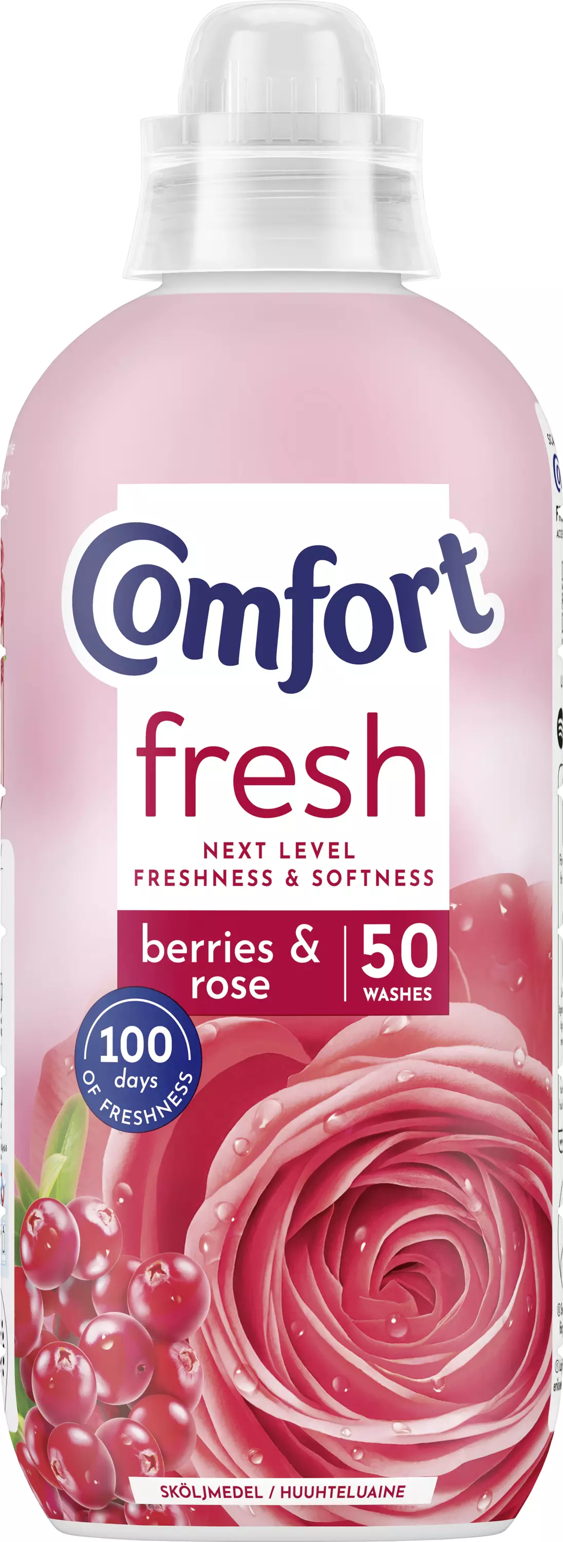 Comfort Berries & Rose -huuhteluaineen mieto puhdas tuoksu muistuttaa sinua kauniista kesäpäivistä. Huuhteluaineessa on puhdas makeiden marjojen tuoksu yhdistettynä klassiseen ruusun tuoksuun. Comfort Berries & Rose sopii täydellisesti sinulle, jolle miellyttävän pehmeä, ilmava ja raikas pyykki on tärkeää. Kun vaatteesi tuoksuvat hyvältä, tunnet olosi virkeämmäksi koko päivän. Comfort Berries & Rose -huuhteluaineen tuoksu on pitkäkestoinen. Huuhteluaineen ainesosat ovat pehmentäviä ja silottavat vaatteiden kuituja. Tämä helpottaa työtäsi, kun sinun on aika silittää vaatteita ja muita tekstiilejä. Comfort-huuhteluaine vähentää staattista sähköä ja auttaa varmistamaan, että vaatteidesi väri ja muoto säilyvät. Comfort-huuhteluaineen koostumus suojaa vaatteitasi epämiellyttäviltä tuoksuilta, jotta voit nauttia pidempään kestävästä raikkaudesta. Käytä seuraavasti: Kaada 15 ml:n annos Comfort Berries & Rose -huuhteluainetta suoraan pesukoneen huuhteluainelokeroon suosikkipesuaineesi viereen. Älä kaada suoraan kankaalle. Valitse ohjelma, käynnistä pesu ja anna koneen hoitaa loput. Comfort on aito ja alkuperäinen huuhteluaine, jota on käytetty vaatteiden hoidossa yli 50 vuoden ajan. Yhdestä Comfort huuhteluainepullosta saat 50 pesua. Huuhteluaineen pullo on valmistettu 100 % kierrätettävästä muovista, etikettejä lukuun ottamatta.Comfort-huuhteluaineen edut • Tekee vaatteista ja pyyhkeistä ilmavia, pehmeitä ja tuoksuvia • Vähentää staattista sähköä • Helpottaa vaatteiden silitystä ja muuta vaatehuoltoa • Säilyttää tekstiilien värin ja muodon • Antaa vaatteille raikkautta ja tuoksua, joka kestää koko päivän • Suojaa hajuilta