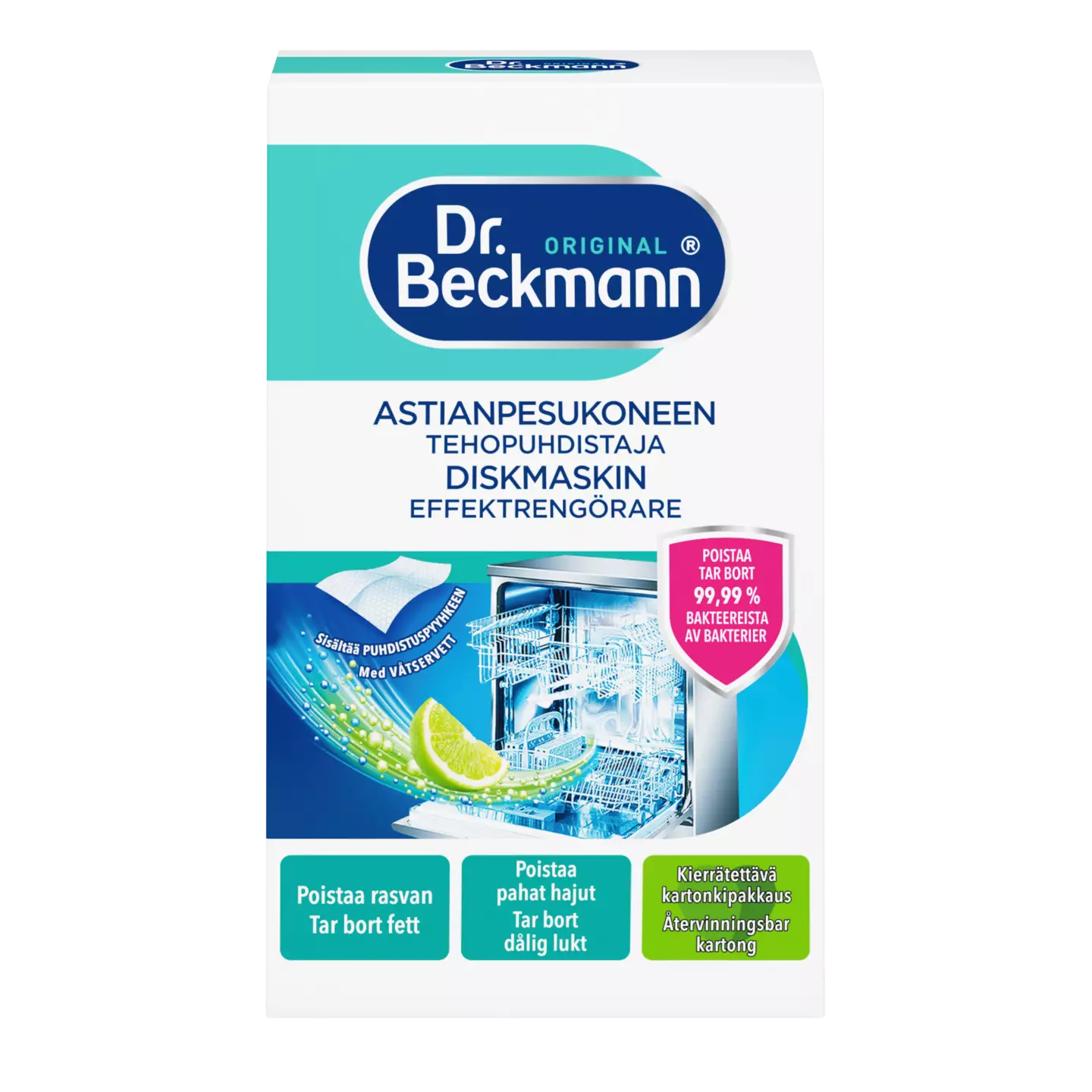 Dr. Beckmann Astianpesukoneen tehopuhdistaja puhdistaa koneen 2-vaiheisesti. Puhdistuspyyhkeen avulla poistetaan likaa ja hoidetaan kumitiivisteitä ja reunoja. Jauhe puhdistaa astianpesukoneen sisältä ja erityisen vaikeasti käsiteltävät osat, kuten siivilän, poistoaukon, vesipumpun ja ruiskutusvarret hygieenisesti ja hajuja poistaen. Astiat pestään puhtaiksi vain puhtaalla koneella.