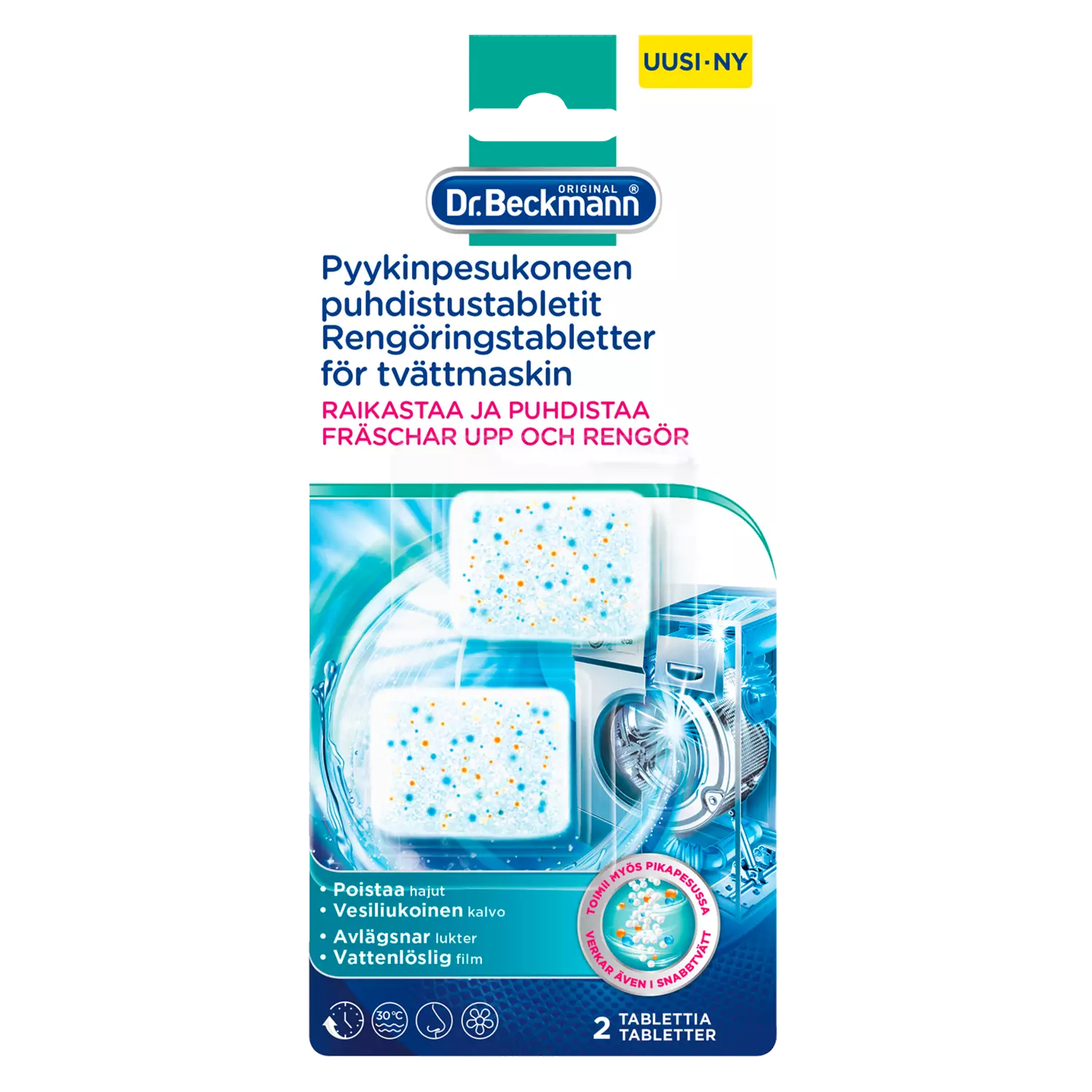 Kätevää puhdistusta. Tablettien aktiivihappi puhdistaa pesukoneen ja samalla hajunpoistaja raikastaa ja poistaa pahat hajut koneesta. Toimii jo 30°C lämpötilassa. Tabletin suojakalvo liukenee veteen.