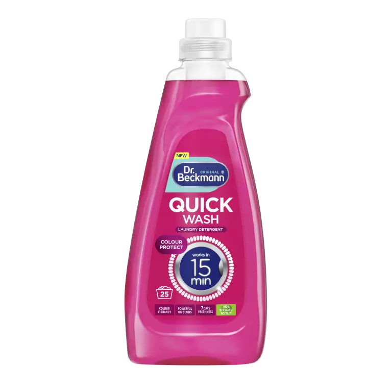 Uusi Dr. Beckmann Quick Wash -tuoteperhe on uusi tehokkuuden virstanpylväs – tahrattoman puhdasta pyykkiä hetkessä. Perinteiset pyykinpesuaineet tarvitsevat pitkiä pesuohjelmia lian ja tahrojen hajottamiseen, kun taas kehittynyt Quick Wash -teknologia puhdistaa perusteellisesti vain 15 minuutissa – suorituskyvystä tinkimättä. Quick Wash Technology®” syväpuhdistaa kuiduista asti, ja ehkäisee värien leviämistä – suojaa sekä valkoiset että värilliset tekstiilit. Quick Wash Color sopii erityisesti värikkäälle pyykille. Yhdestä pullosta saat 25 pesua.