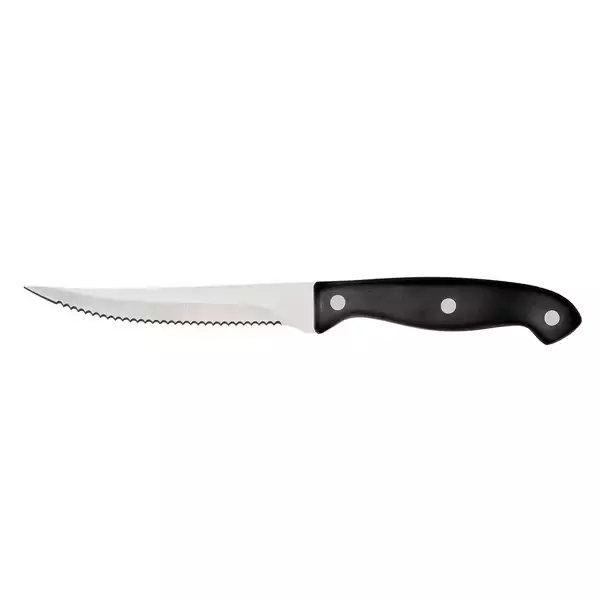 Ajaton ja laadukas teräksinen pihviveitsi. Musta tyylikäs kahva sopii jokaiseen kattaukseen. Sahalaitainen veitsiteräksestä valmistettu terä leikkaa lihan tasaisesti ja helposti. Läpiniitattu... Lue lisää