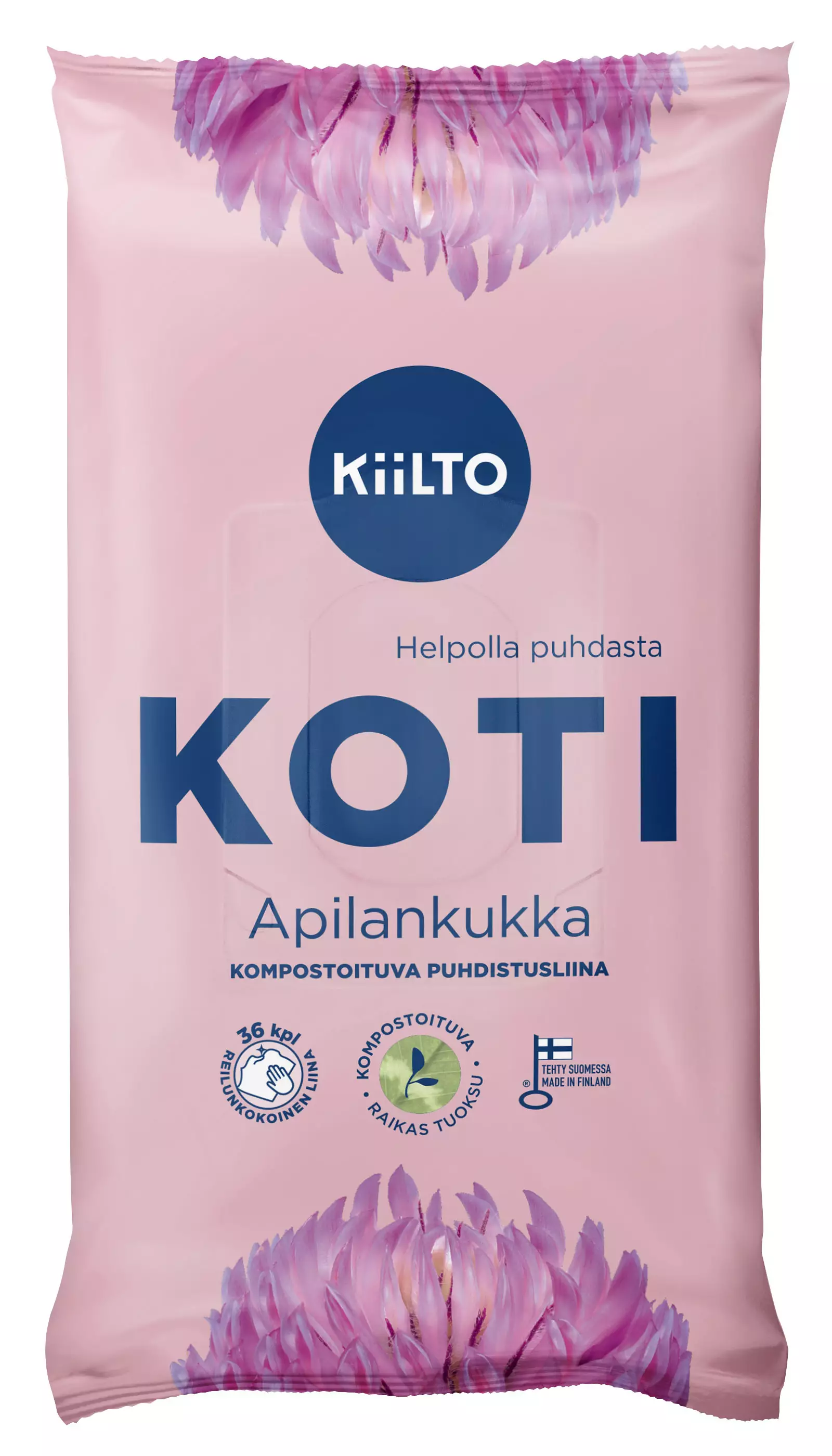 Kotimainen käyttövalmis Kiilto Koti yleispuhdistusliina Apilankukka puhdistaa helposti ja tehokkaasti pölyn ja tahrat kaikilta kosteaa pyyhkimistä kestäviltä kovilta pinnoilta jättäen kodin raikkaan tuoksuiseksi. Ympäristöystävälliset, kompostoituvat liinat on pakattu kierrätettävään muoviin.