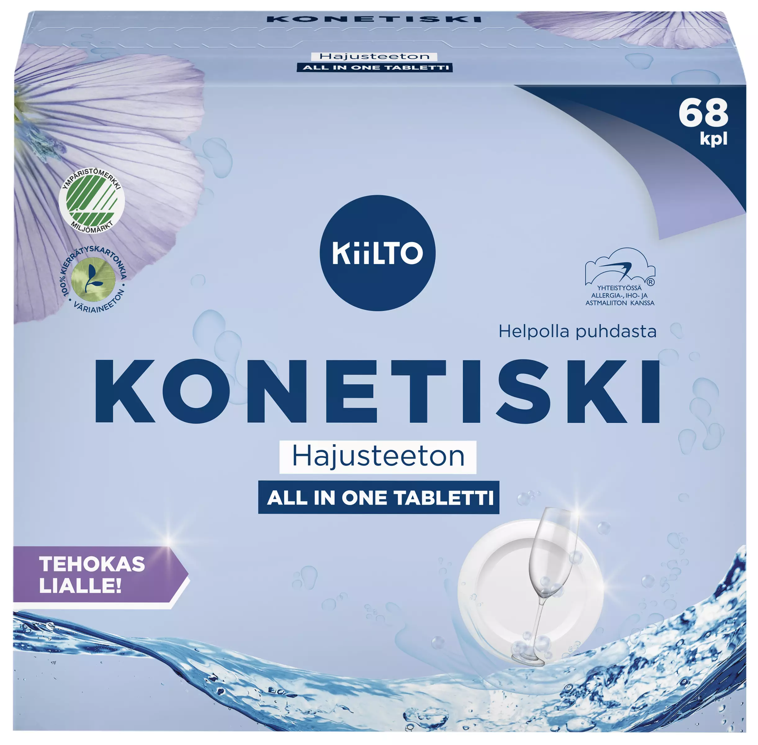 Kiilto All in 1 konetiskitabletti Hajusteeton pesee astiat puhtaiksi tehokkaasti ja ympäristöystävällisesti jo matalissa lämpötiloissa. Tablettien fosfaatiton ja tiivistetty koostumus vähentää ympäristökuormitusta. Helppokäyttöiset tabletit on pakattu suojakääreeseen, joka liukenee pesussa. Tuotteelle myönnetty Joutsenmerkki takaa, että tuotteen ympäristövaikutukset on arvioitu, tuote on käyttäjälleen turvallinen ja tutkitusti tehokas. Tuotteella on Allergia, Iho- ja Astmaliiton Allergiatunnus.