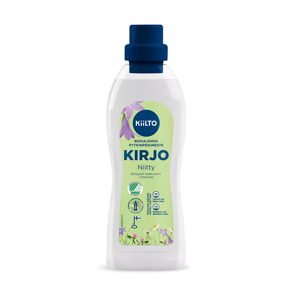 Kotimainen, 100 % biohajoava Kiilto Kirjo pyykinpesuneste Niitty pesee vaatteet tehokkaasti jo 30 asteen lämpötilassa aina 95 asteeseen asti. Soveltuu käsin- ja konepesuun sekä tahranpoistajana suoraan tekstiilille pitäen värit kirkkaina. Suomalaisen luonnon inspiroima mieto keväisen Niityn tuoksu tekee pyykinpesusta miellyttävää. Tuotteen 100 % helposti biohajoava ja yli 90 % kasviperäinen koostumus sekä 100 % kierrätysmuovista valmistettu, uudelleen kierrätettävä pullo minimoivat pyykinpesun ympäristökuormituksen. Tuotteelle myönnetty Joutsenmerkki takaa, että tuotteen ympäristövaikutukset on arvioitu, tuote on käyttäjälleen turvallinen ja tutkitusti tehokas. Väriaineeton ja vegaaninen. Ei sovellu villalle ja silkille.