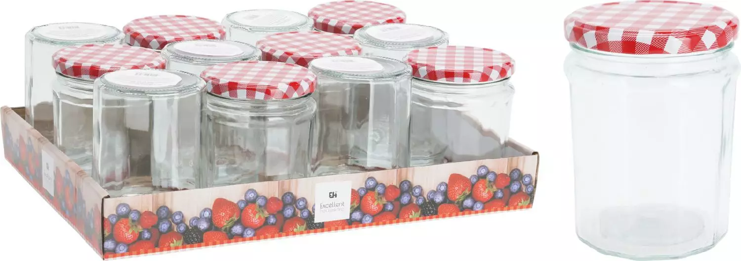Lasinen säilykepurkki (450ml) metallikannella. Esim. hillojen ja säilykkeiden säilytykseen.