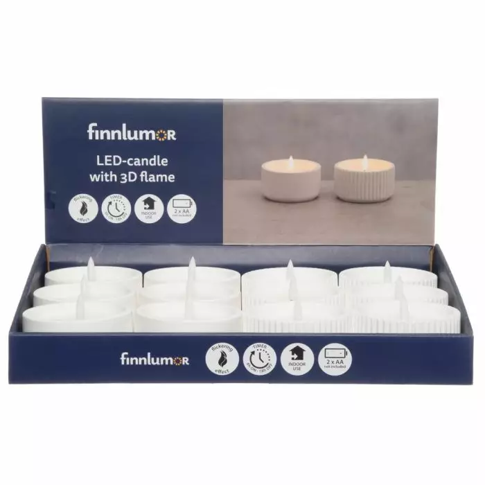LED-kynttilä aidonnäköisellä 3D-liekillä. Kynttilä on sementtikipossa. Ajastintoiminto 6 h on/18 h off. Paristot 2 x AA (ei sisälly).