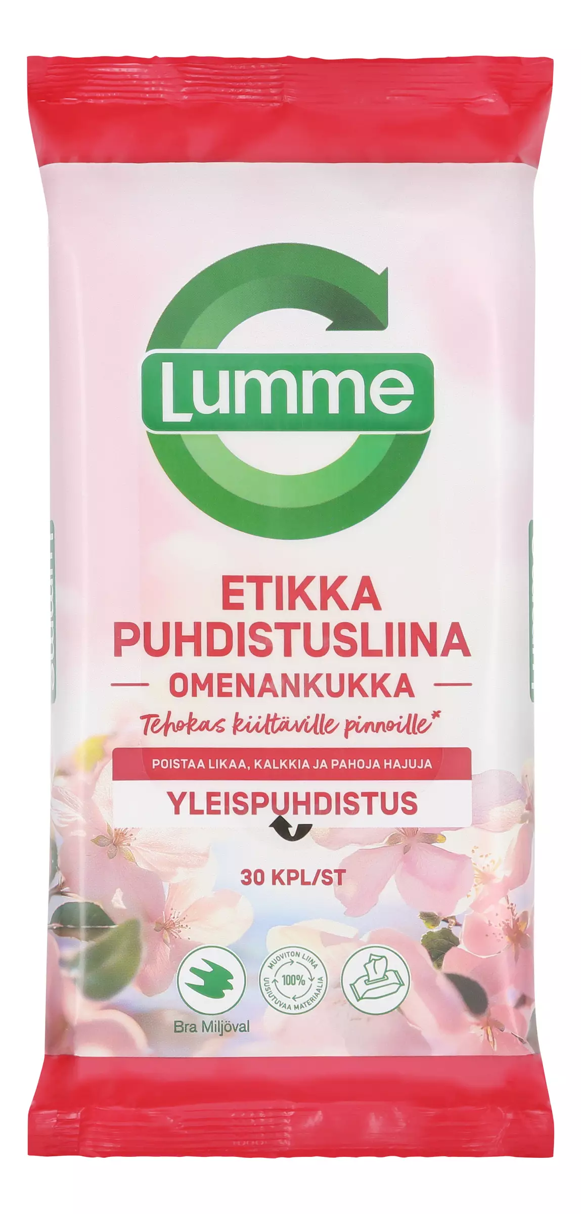Lumme Etikkapuhdistusliina on kertakäyttöinen puhdistusliina nopeaan puhdistukseen kiiltäville pinnoille. Sopii myös ruokapöytien ja keittiötasojen jne. arkisiivoukseen. Valikoidut ainesosat poistavat tehokkaasti kalkin, lian ja muut tahrat kodissa. Ei saa käyttää marmori- ja luonnonkivipintojen puhdistukseen. Puhdistusliinat poistavat pahaa hajua ja niissä on ihana omenankukan tuoksu, joka jättää kotisi hyväntuoksuiseksi. Ympäristömerkitty Bra Miljöval -merkillä. Muoviton liina - 100 % uusiutuvaa materiaalia.