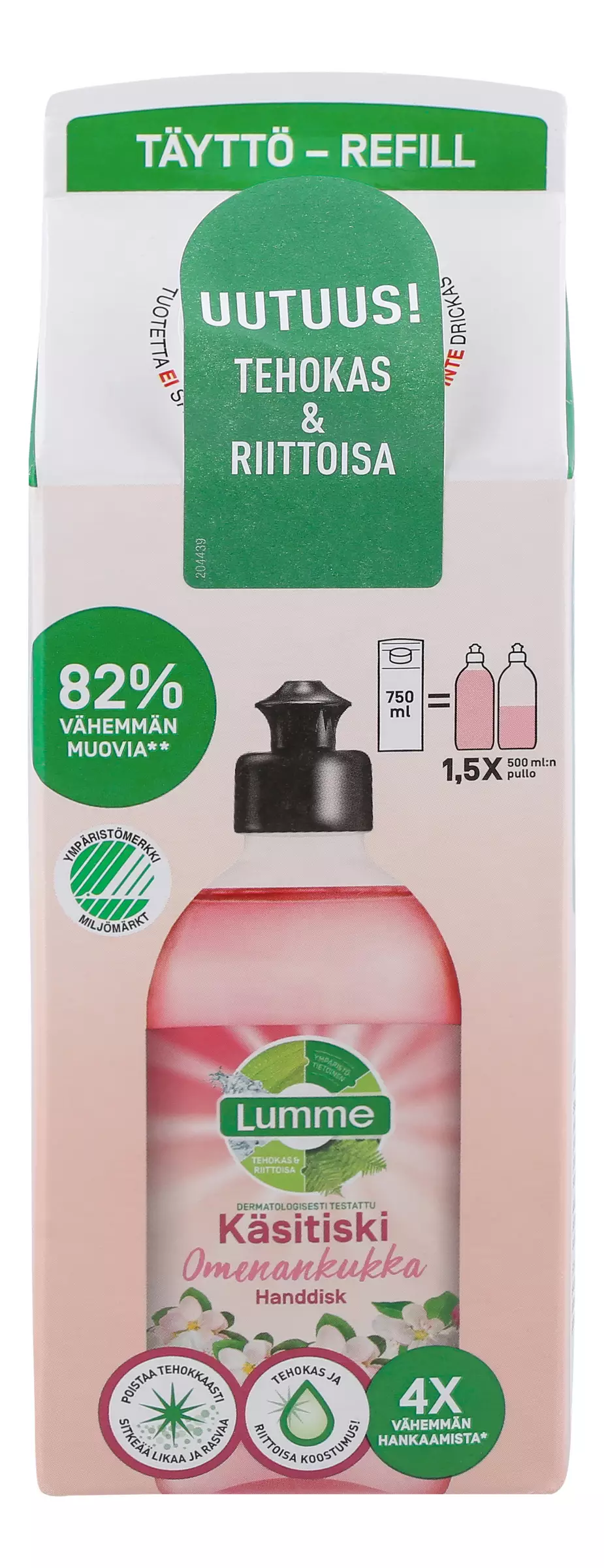 Ympäristömerkitty Lumme Käsitiskiaine puhdistaa tehokkaasti sitkeää likaa ja rasvaa, sekä jättää astiat kiiltävän puhtaiksi. Tuotteessa on ihana omenankukan tuoksu, joka poistaa tehokkaasti kalasta, valkosipulista ja ruokajäämistä tullutta pahaa hajua, sekä astioista että tiskirätistä. Riittoisa ja tehokas koostumus – 2 ml riittää 5 litraan vettä. Vegan Society -sertifioitu. Dermatologisesti testattu herkällä iholla. Kartonkisessa täyttöpakkauksessa on 82 % vähemmän muovia kuin 1,5:ssa Lumme Käsitiskiaine -pullossa (a' 500 ml). Kierrätä pakkaus kartonkina ja korkki muovina. Yksi täyttöpakkaus sisältää täytöt 1,5 pullolle.
